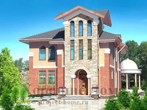 Отделка фасада – облицовочный кирпич, природный камень, декоративная штукатурка с элементами декора в виде замковых камней и карнизов.