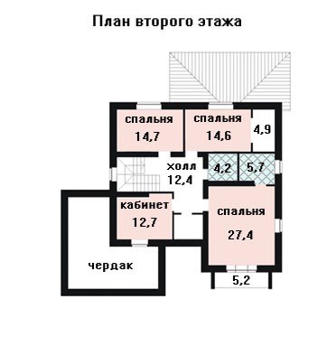 Особенностью этого проекта можно назвать наличие небольшого чердачного помещения, выход на которое находится в кабинете, расположенном на втором этаже. Использовать его можно как в качестве чердака, так и переобустроить, например, в небольшую бильярдную комнату.
