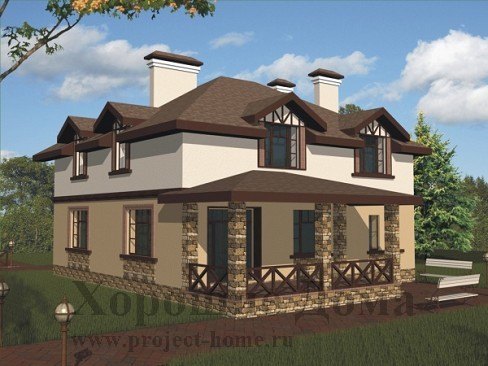 Уютный особняк, подходящий для проживания небольшой семьи, как в черте города, так и за ее пределами. Дом искусно украшен имитацией каркасного типа в стиле старого немецкого коттеджа. Для многих семей ценным дополнением проекта является наличие довольно просторного гаража, рассчитанного на два автомобиля, что играет порой ключевую роль при выборе проекта коттеджа.