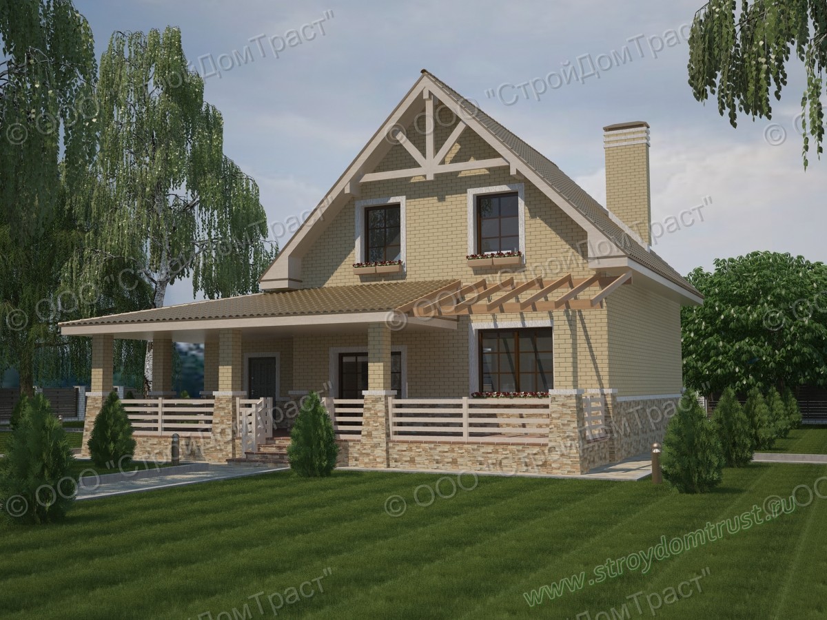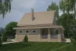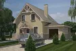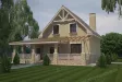 Этот коттедж имеет множество вариантов отделки и будет хорошо смотреться практически в любом цвете. Сочетание на фасаде нескольких видов отделочных материалов, декоративные карнизы и наличники на окнах, украшение на фронтоне и под козырьком над главным входом, перила из балок на террасе — все эти детали создают облик современного экологичного жилища.