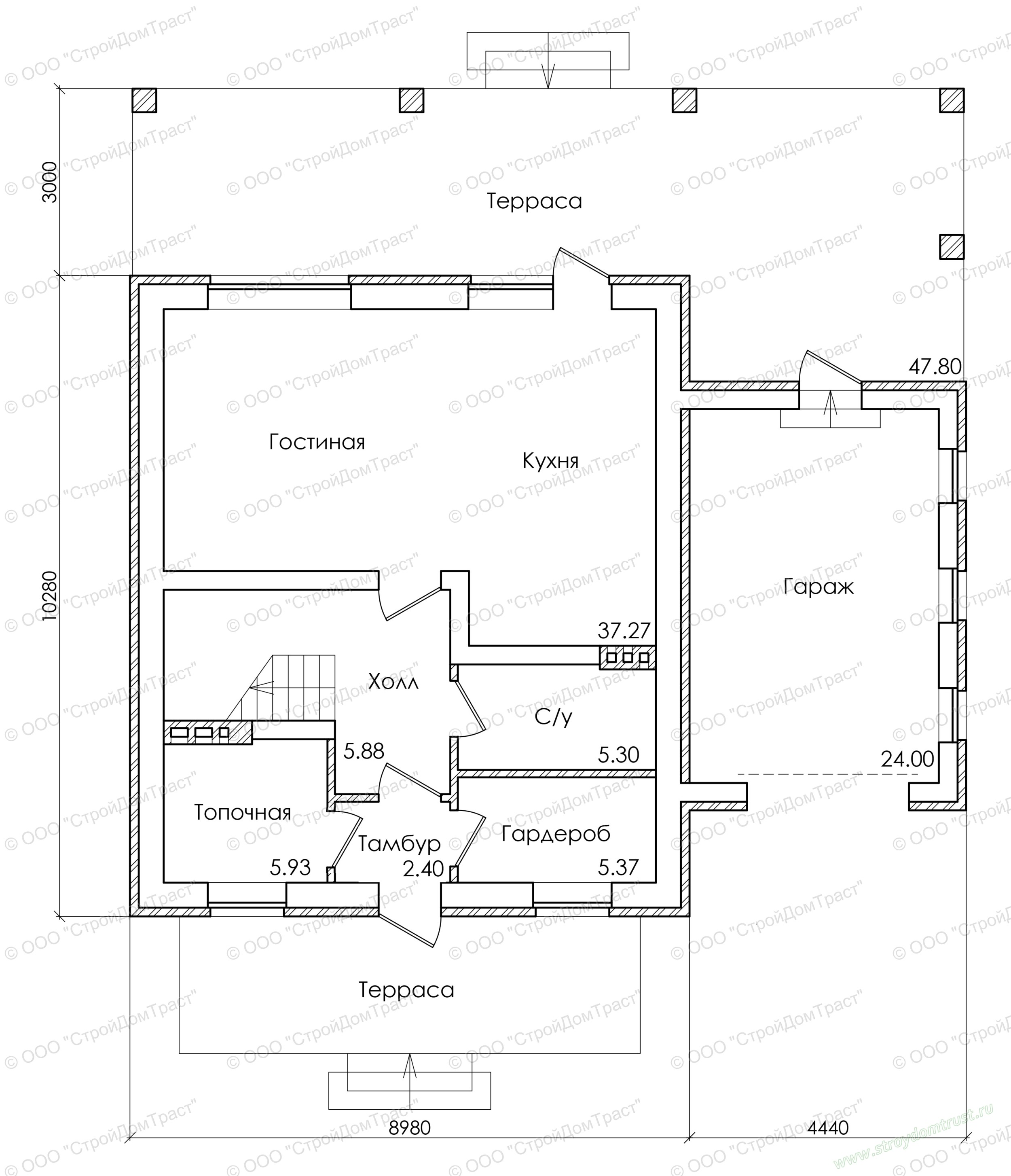 Планировка дома хорошо продумана. На первом этаже находится большая кухня-гостиная (37,3 кв.м), здесь поместится все необходимое для приготовления и приема пищи, а также для отдыха всей семьи. Форма комнаты позволяет легко выполнить функциональное зонирование и при этом не ограничивает фантазию владельцев дома при выборе дизайн-проекта. Также на этаже располагаются тамбур (2,4 кв.м), гардеробная для верхней одежды (5,4 кв.м), топочная (5,9 кв.м), санузел (5,3 кв.м) и удобный холл (5,8 кв.м).