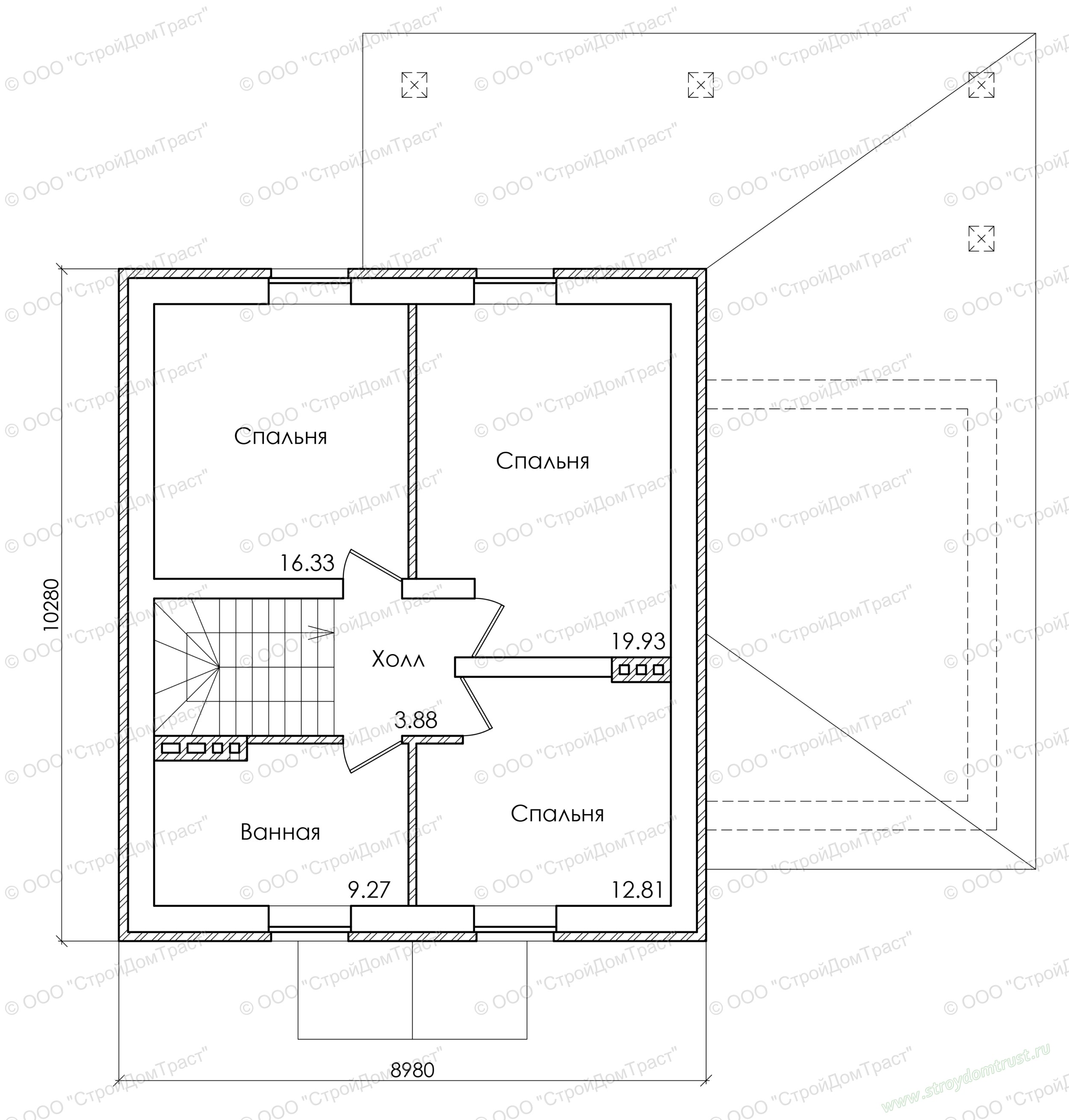 На втором этаже — три уютные спальни (19,9, 16,3 и 12,8 кв.м). Форма комнат позволит оформить их в любом стиле. Также на этаже находится просторный санузел (9,3 кв.м). Соединяет помещения холл (3,9 кв.м).