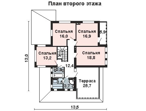 Кухня находится в дальней части дома -18,1 кв. м.- и имеет отдельный выход на довольно большую террасу размером 17,7 кв. м., которая ведет в сад. Четыре спальни второго этажа расположены максимально продуманным образом так, что каждый квадратный метр использован с пользой. Их соединяет длинный коридор, ведущий на большую террасу-балкон, занимающую территорию в 25,7 кв. м.