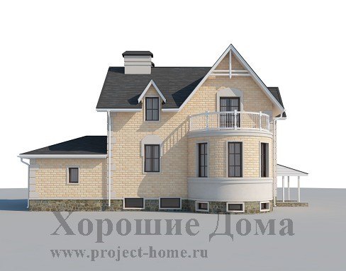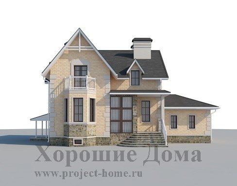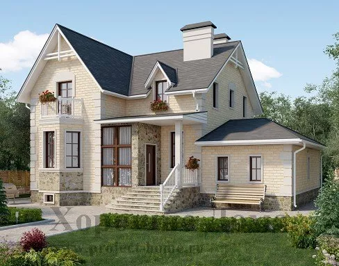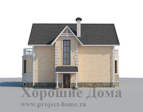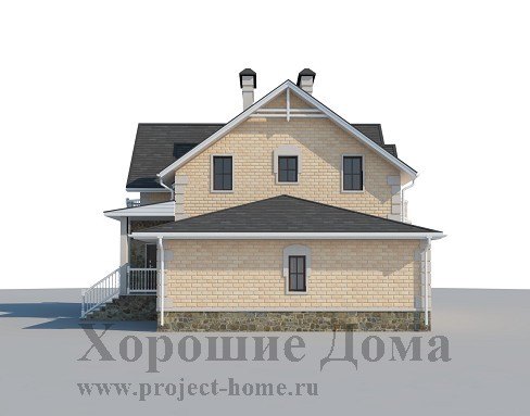 Отделка фасада - облицовочный кирпич с элементами декора и фрагментами натурального камня, цоколь - натуральный камень.