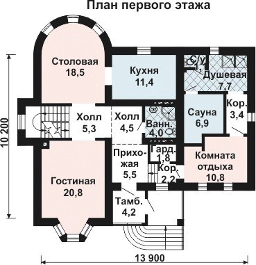 В помещении первого этажа основного здания разместилась зона дневного пребывания членов семьи и хозяйственный блок с кухней. Помещения гостиной и столовой, расширенные за счёт оригинальных эркеров, находятся друг напротив друга и связаны небольшим холлом.