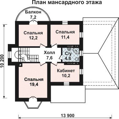 Мансардный этаж полностью занимают три спальни и кабинет, остается только небольшая площадь под холл и санузел. Две спальни имеют выходы на свои балконы.
