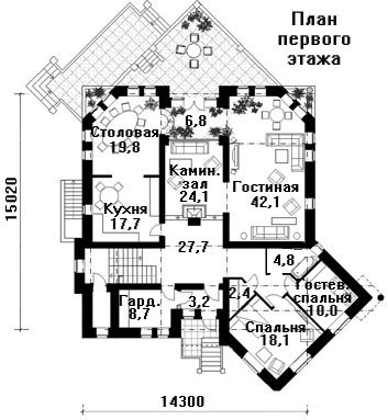 На первом этаже вокруг центрального двусветного каминного зала с выходом на террасу расположены внушительных размеров гостиная и кухня со столовой, соединённые арочным проёмом. Две гостевые спальни удачно разместились в помещении эркера, что создаёт условия для комфортного отдыха вдали от помещений дневного пребывания.