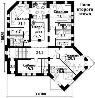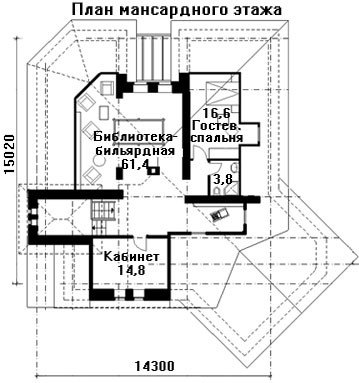Второй этаж – традиционно зона для отдыха и ночного пребывания, на нём сосредоточены спальни для членов семьи, апартаменты и кабинет хозяев дома, ванные и гардеробные комнаты. Мансарда отведена под просторный бильярдный зал с библиотекой, кабинет и дополнительную гостевую спальню.