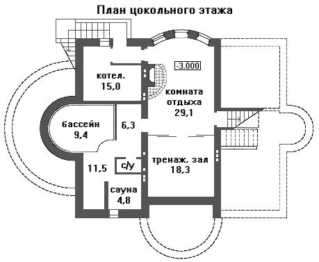 В цокольной части дома размещены технические помещения и оздоровительный комплекс из сауны с бассейном, тренажерного зала и комнаты отдыха. В помещение котельной оборудован отдельный вход со стороны участка.
