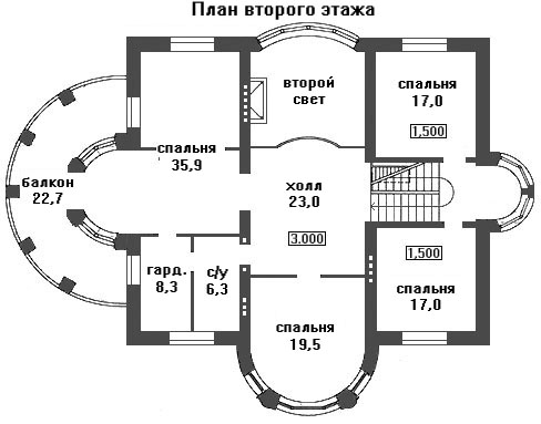 Второй этаж представляет из себя зону ночного пребывания с тремя гостевыми спальнями. Роскошная спальня хозяев расположена над помещениями столовой и кабинета, её центральным местом является шикарный эркер, из которого можно попасть на эффектный полукруглый балкон с чарующим видом на окрестный ландшафт.