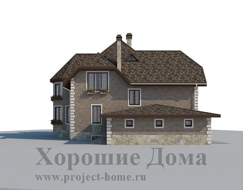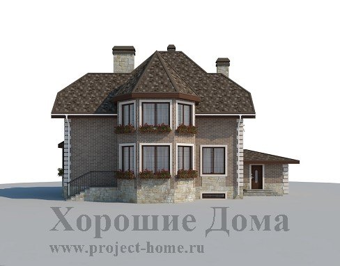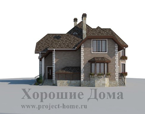 Отделка фасада и цоколя – кирпич и натуральный камень, соответственно. Выступающие белые элементы фасада и колонна на входе приятно освежают внешний вид дома и придают ему определённый изыск. Планировка дома очень удобна и продумана. Все хозяйственные и подсобные помещения скрыты на цокольном этаже, куда имеется вход как из первого этажа дома, так и отдельный вход со стороны улицы. На первом этаже дома размещена гостевая спальня, уютная кухня-столовая совмещённая с гостиной, из которой есть выход на закрытую веранду, а оттуда - в сад. Лестница из просторного холла ведёт на второй этаж, который полностью отдан под спальни, две из которых имеют выход на застеклённую террасу.
