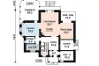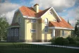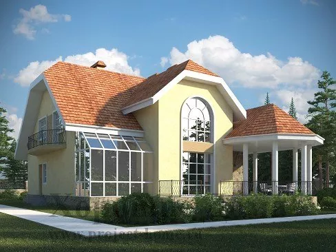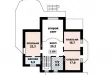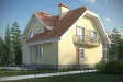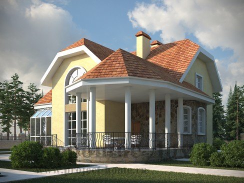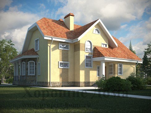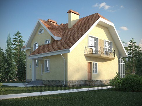 В этом проекте коттеджа довольно удачно сочетаются уже привычная трехпролетная схема конструкции со всеми необходимыми помещениями, которые вполне отвечают требованиям современной семьи. Большая прихожая вмещает в себя большую комфортную лестницу, которая ведет на второй полу-мансардный этаж.