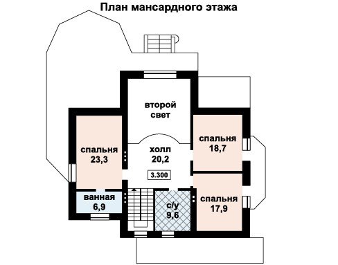 Второй этаж вмещает в себя большой холл, ведущий в три спальни 17,9 кв. м., 18,7 кв. м. и 23,3 кв.м.