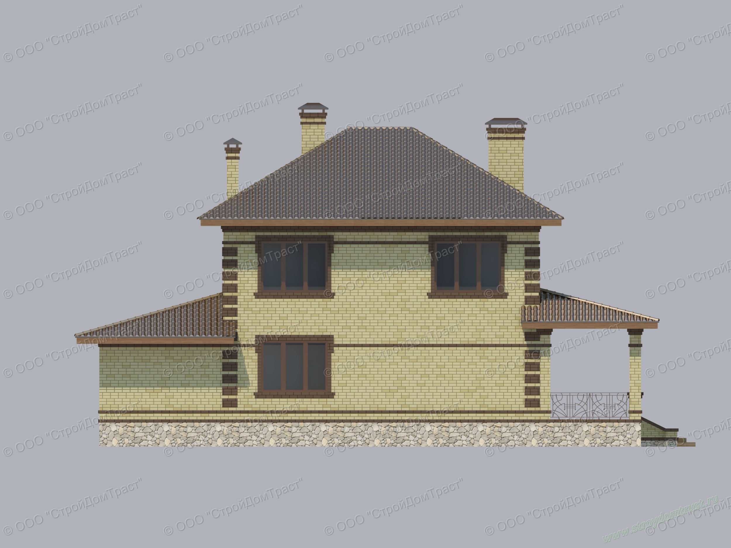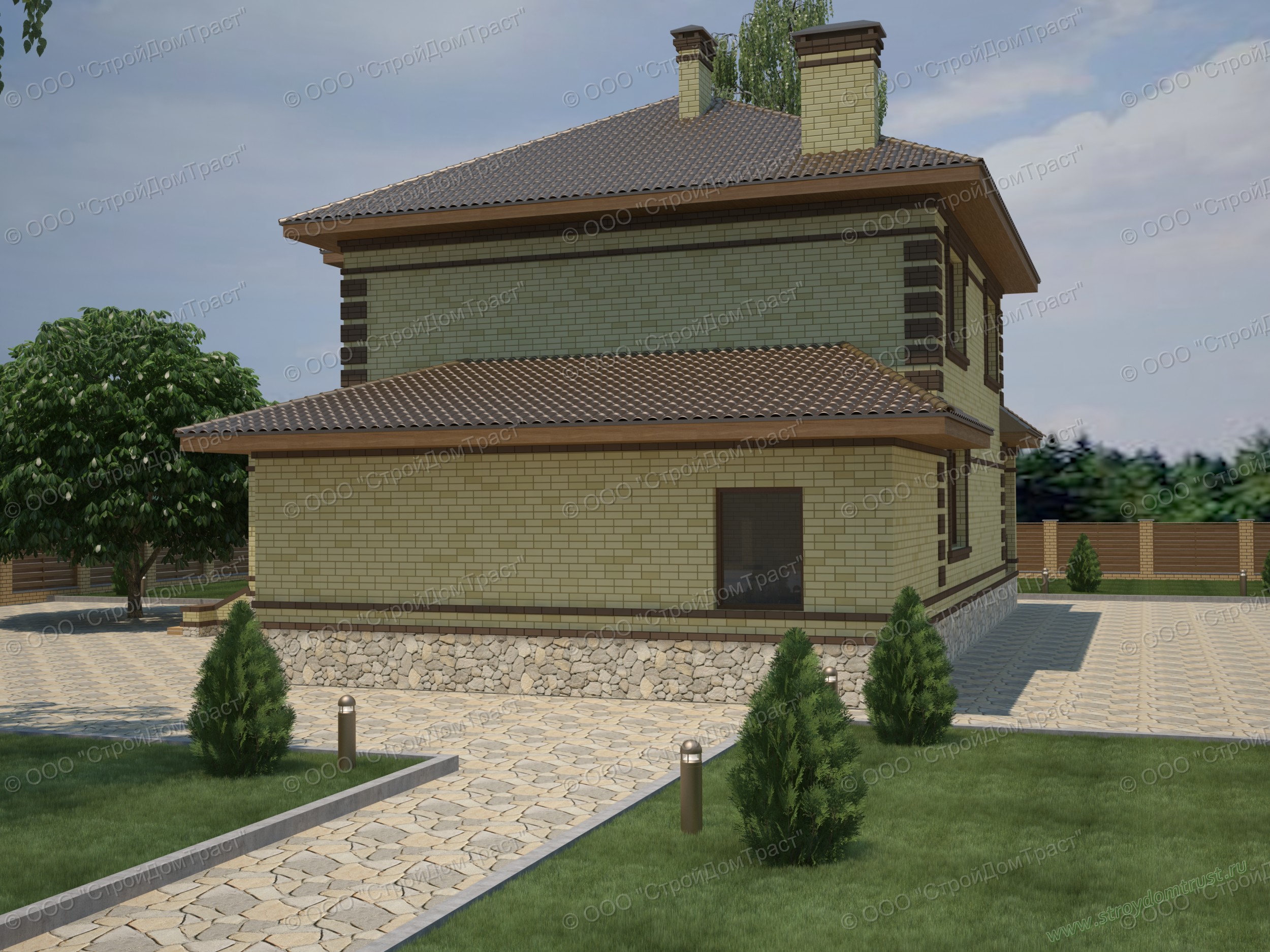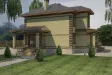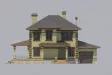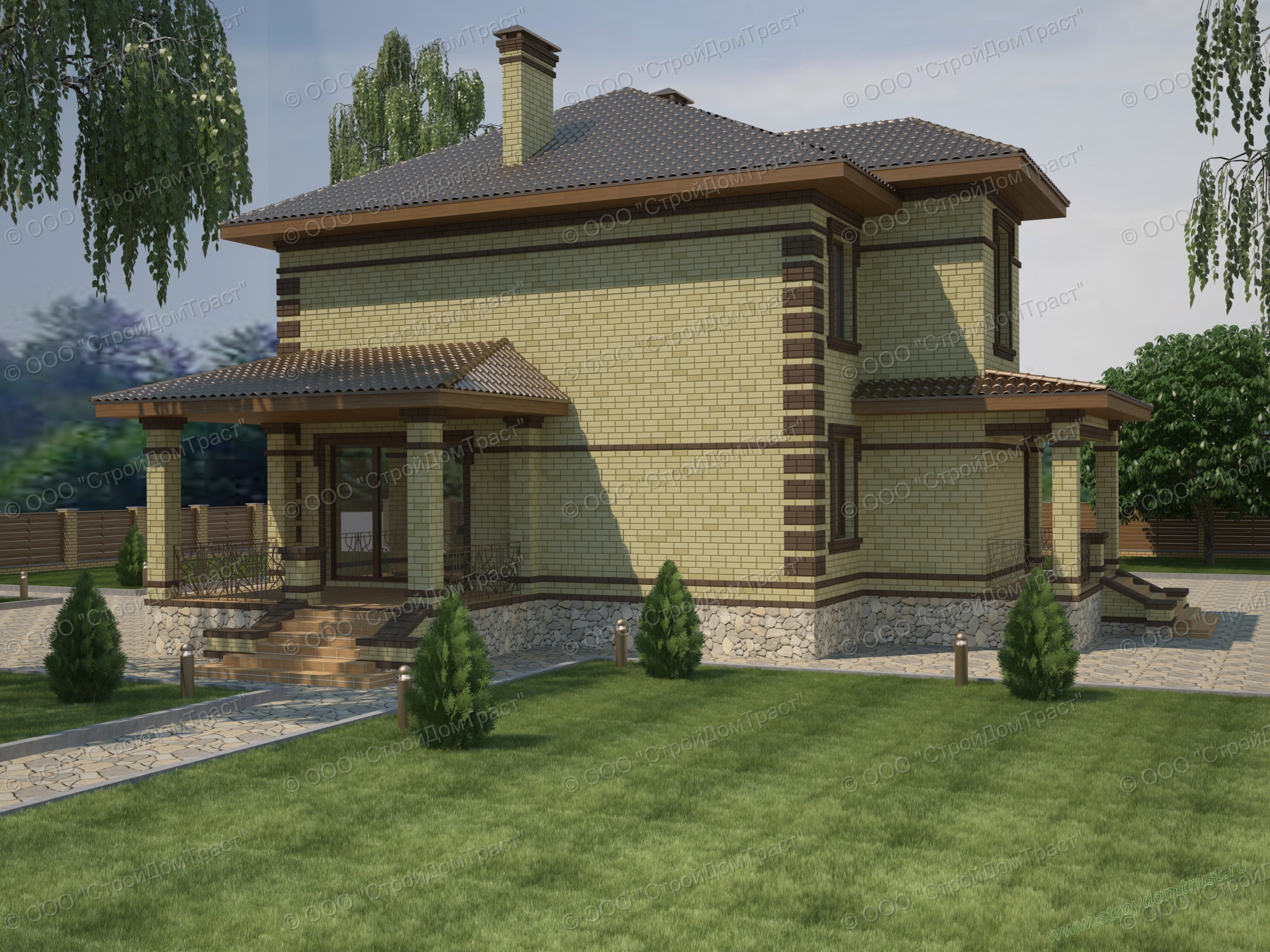 Стены дома отделаны облицовочным кирпичом двух контрастных цветов. Сейчас производители выпускают данный материал в широкой палитре, поэтому цвет дома может быть практически любым. С помощью кирпича темного цвета на фасаде имитируются украшения характерные для классического архитектурного стиля: лепнина на углах здания, декоративные карнизы, наличники на окнах. Крыльцо дома украшают колонны и кованые перила.