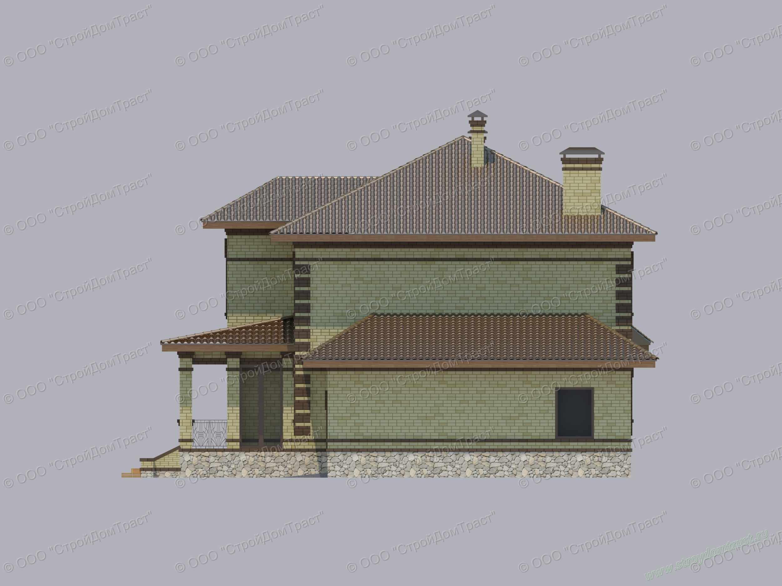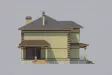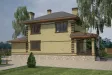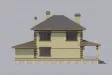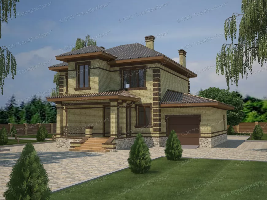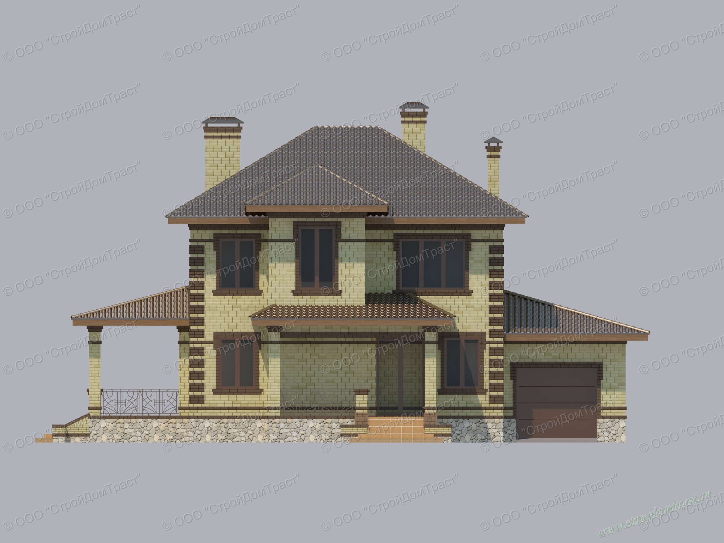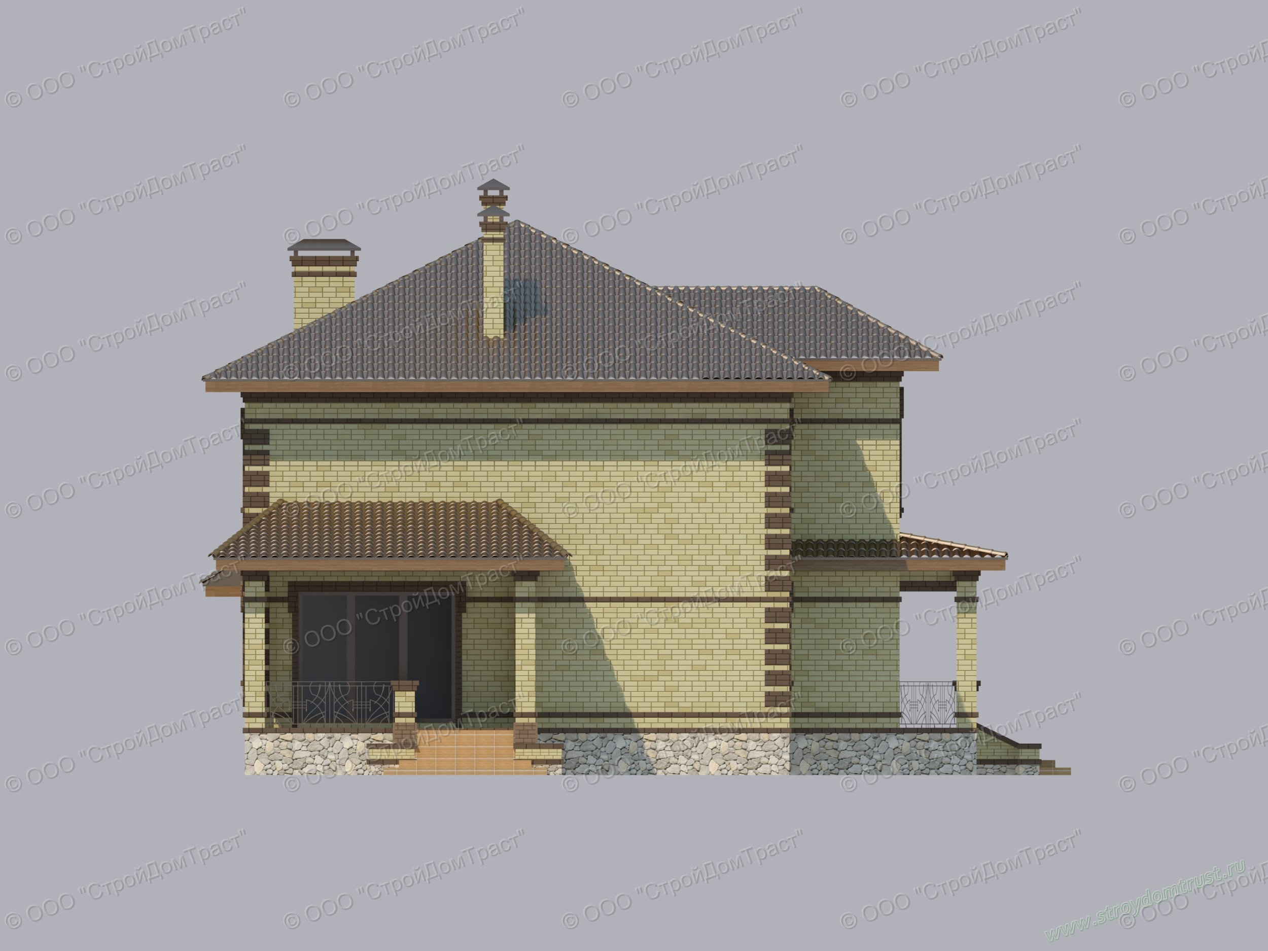 Стены дома отделаны облицовочным кирпичом двух контрастных цветов. Сейчас производители выпускают данный материал в широкой палитре, поэтому цвет дома может быть практически любым. С помощью кирпича темного цвета на фасаде имитируются украшения характерные для классического архитектурного стиля: лепнина на углах здания, декоративные карнизы, наличники на окнах. Крыльцо дома украшают колонны и кованые перила.