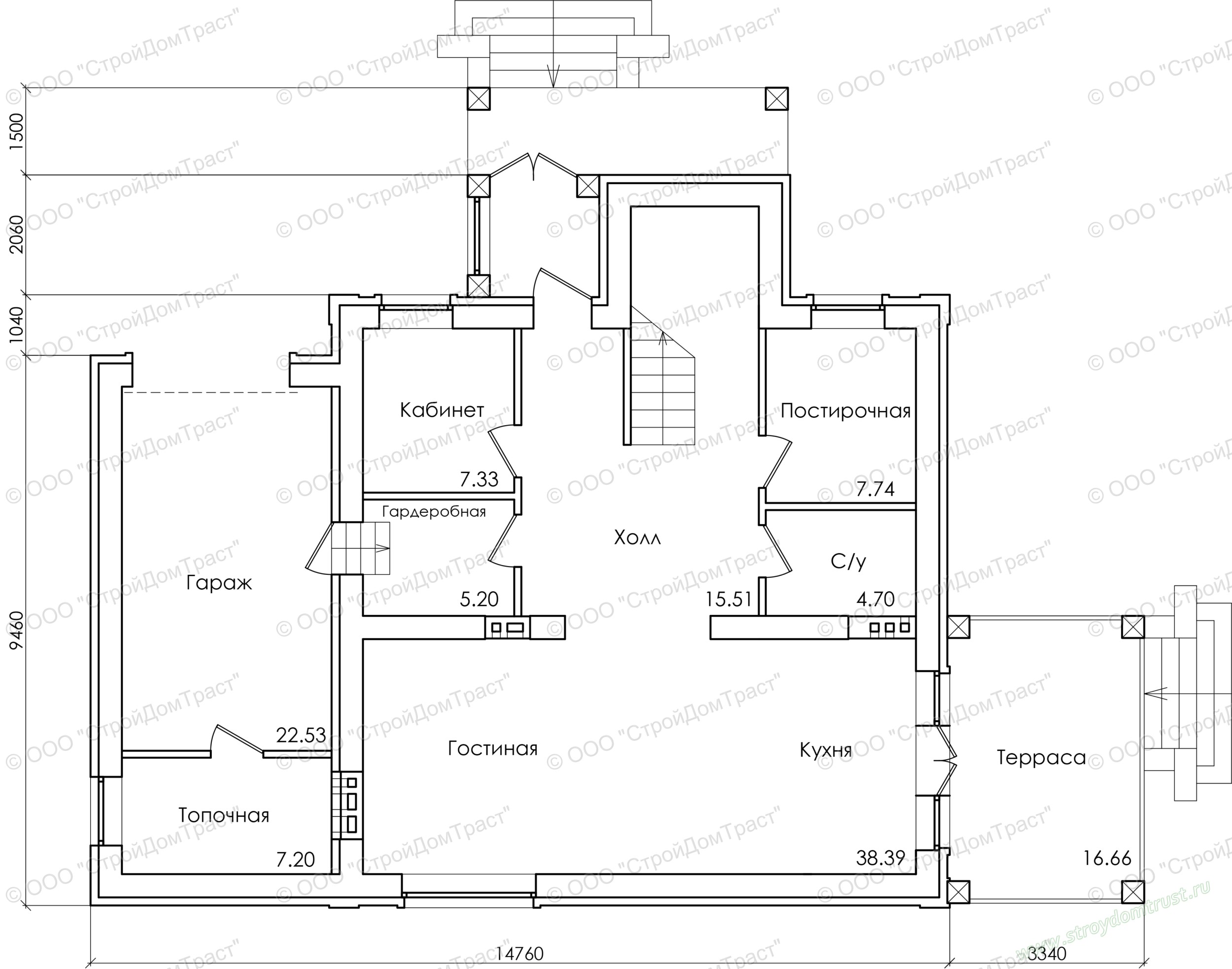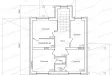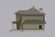 Внизу располагается просторная кухня-гостиная (38,4 кв.м). Комната имеет прямоугольную форму, что позволит обладателям дома без труда выполнить функциональное зонирование и подобрать дизайн помещения под свои пожелания и вкус. Из кухни можно выйти на крытую террасу (16,6 кв.м), на которой можно обедать на свежем воздухе в теплое время года. Также на первом этаже находятся компактный кабинет (7,3 кв.м), санузел (4,7 кв.м), постирочная (7,7 кв.м) и гардеробная (5,2 кв.м). Соединяет все помещения холл (15,5 кв.м) с прямоугольным эркером, в который для экономии места убрана лестница на второй этаж.