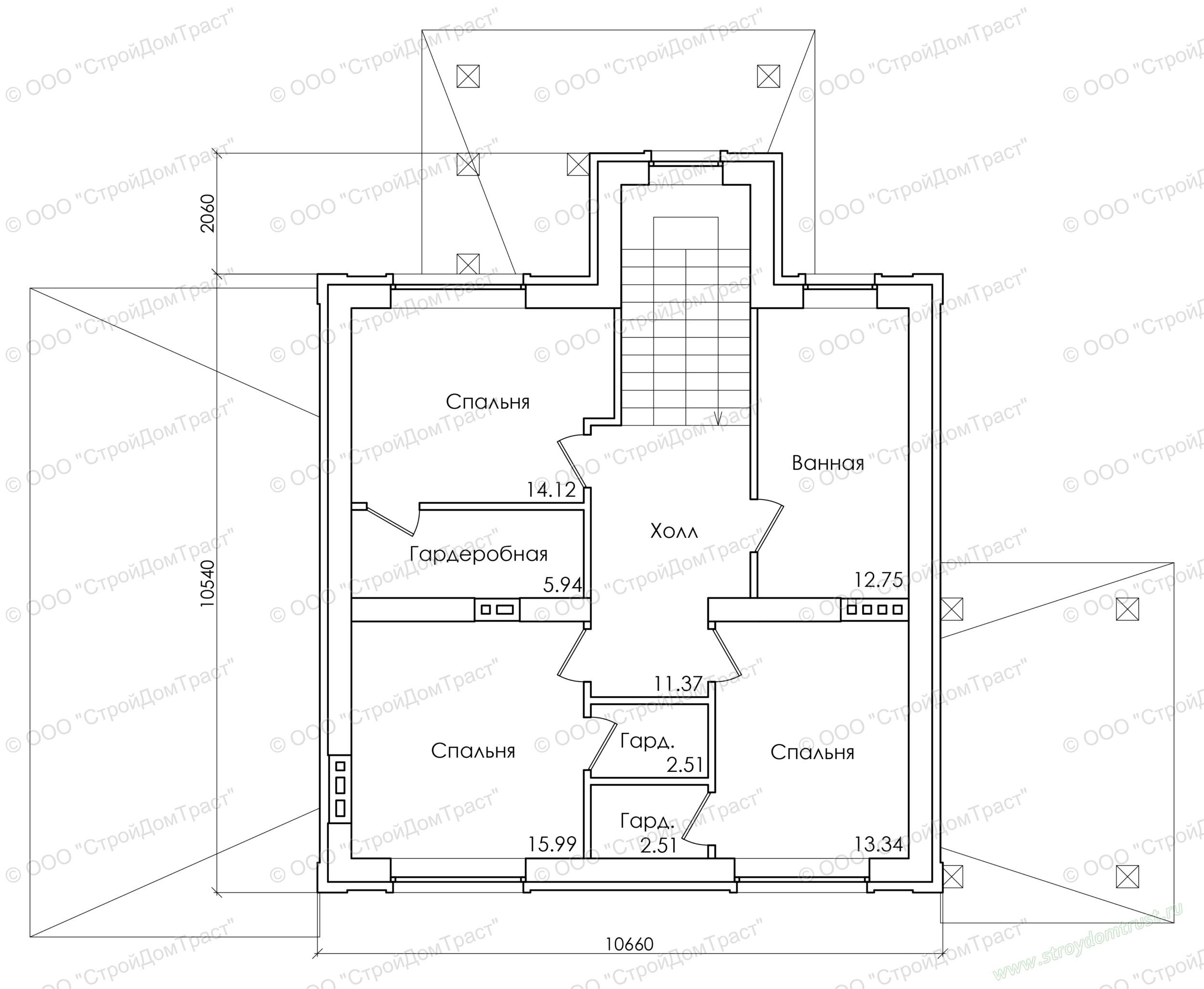 Наверху три комфортабельные спальни, каждая из которых имеет персональную гардеробную. Все комнаты практически одинаковой площади, что позволит легко распределить их между обитателями дома. Кроме того, на этаже предусмотрена большая ванная (12,7 кв.м).