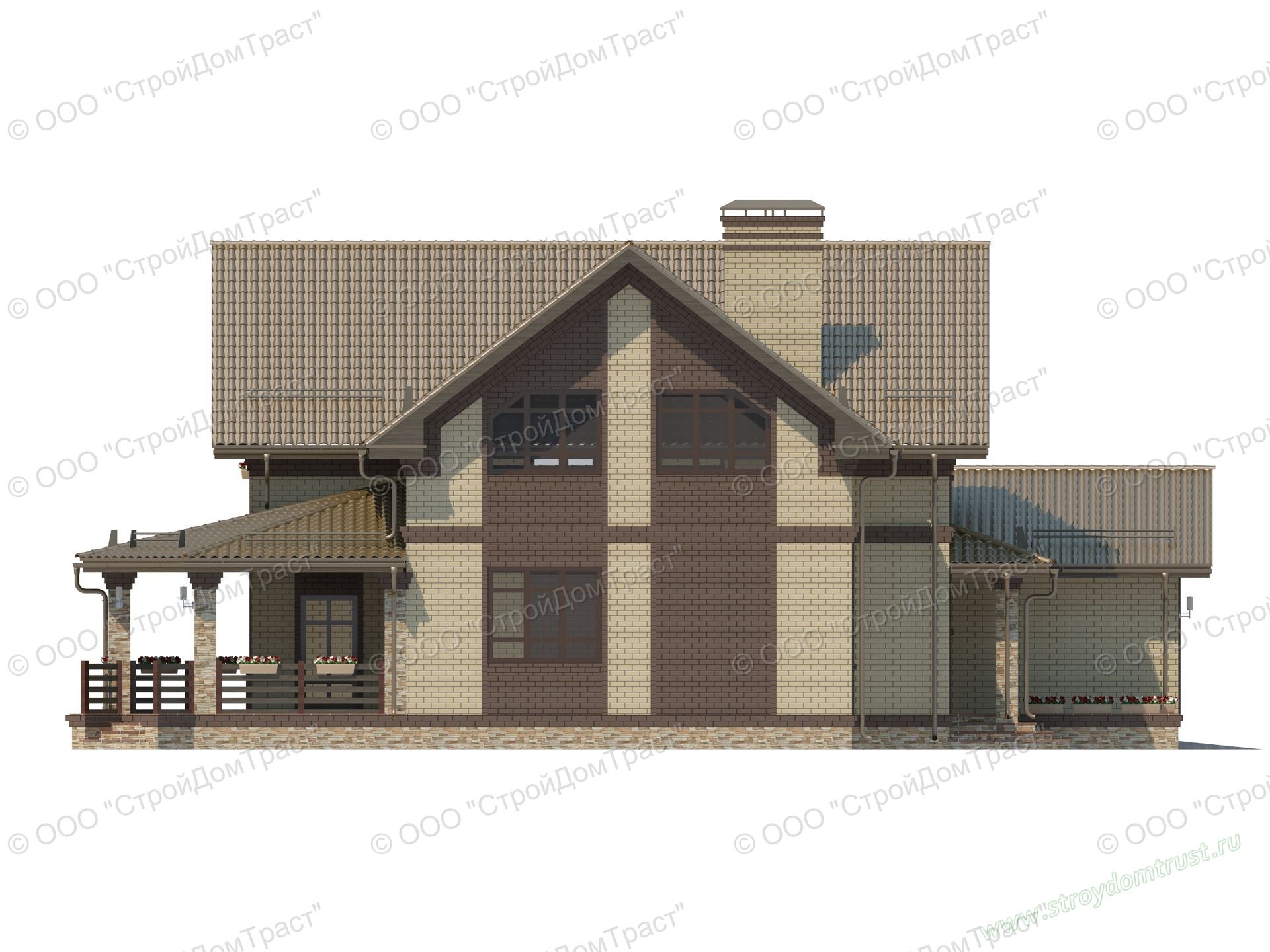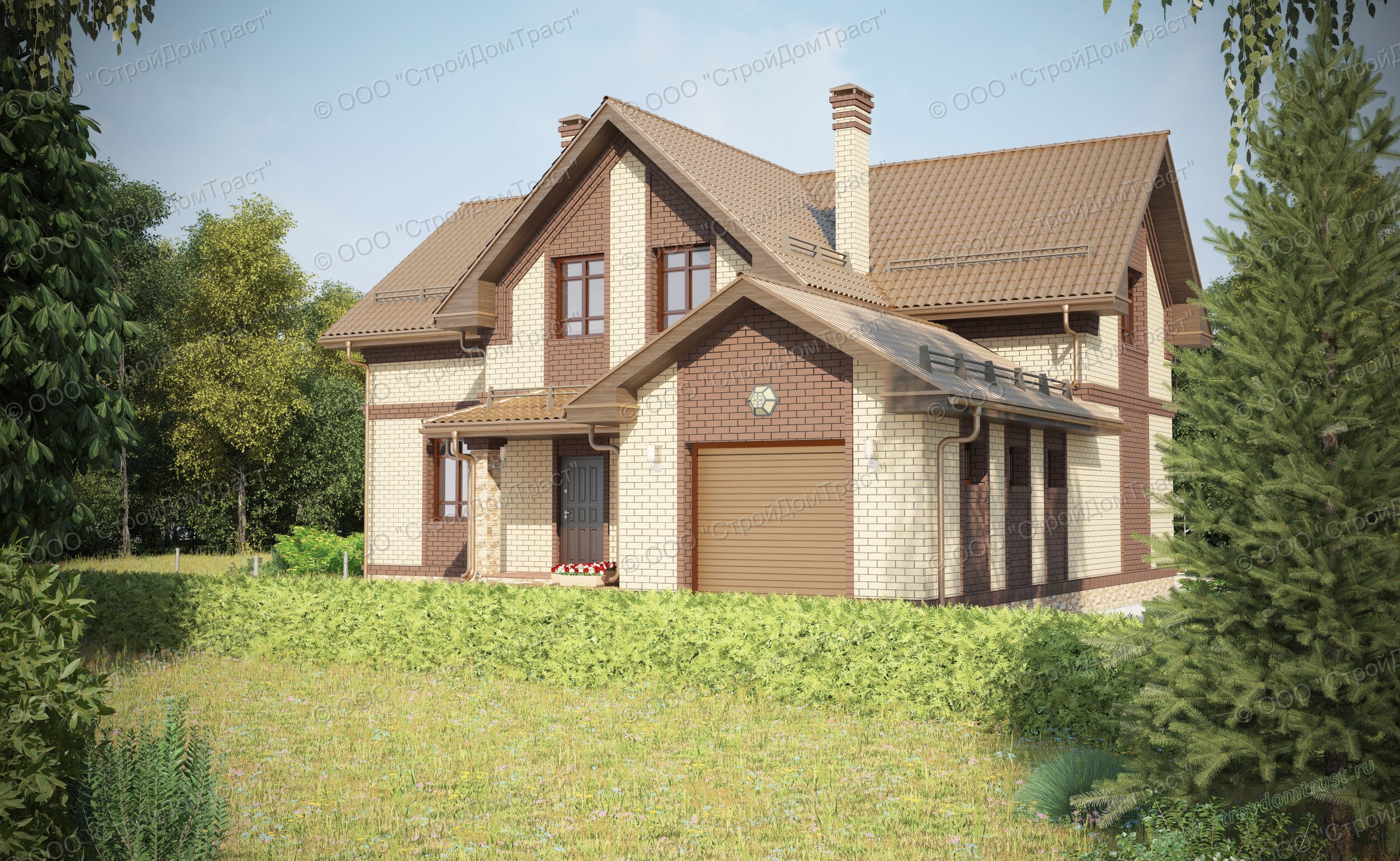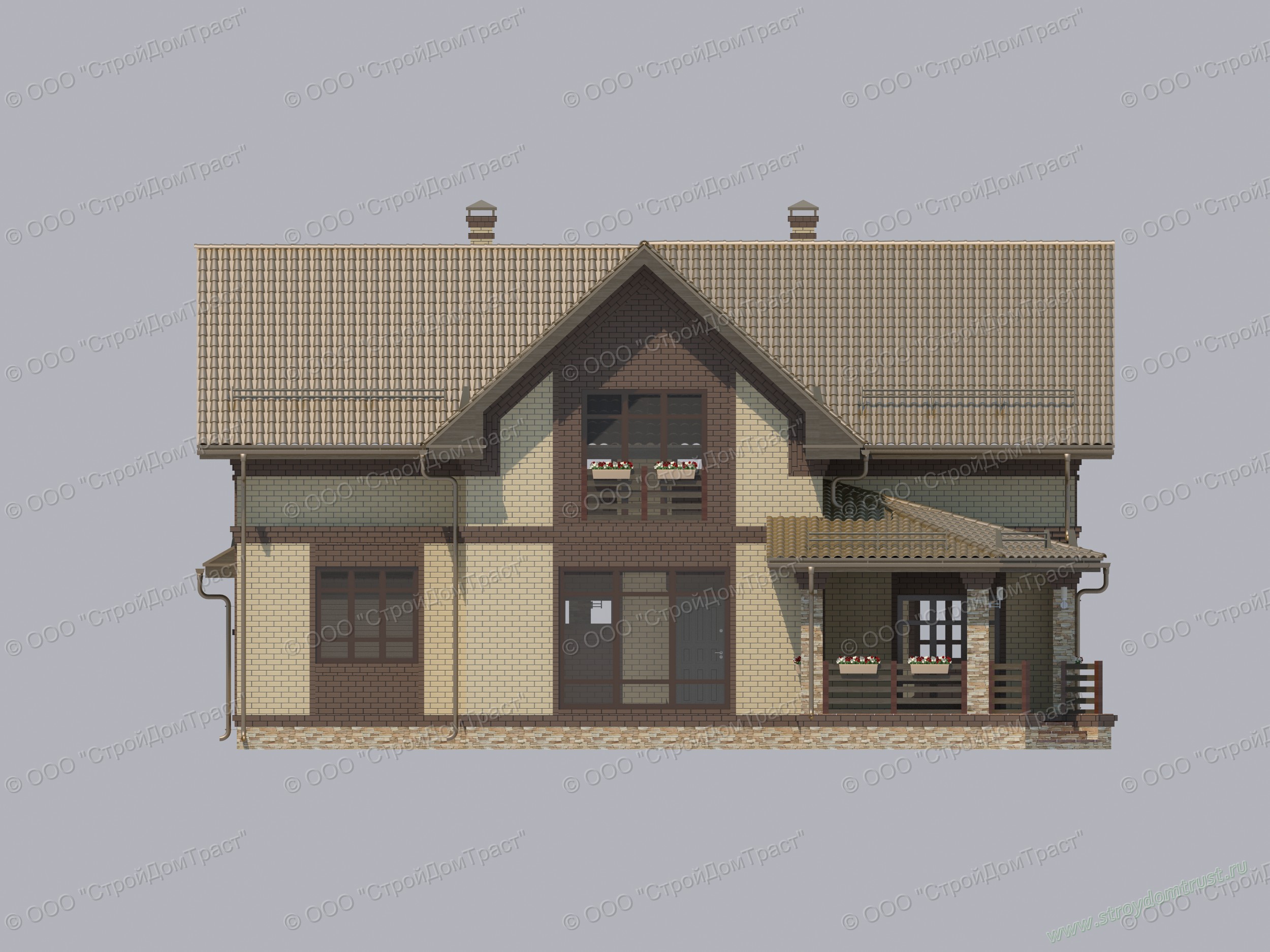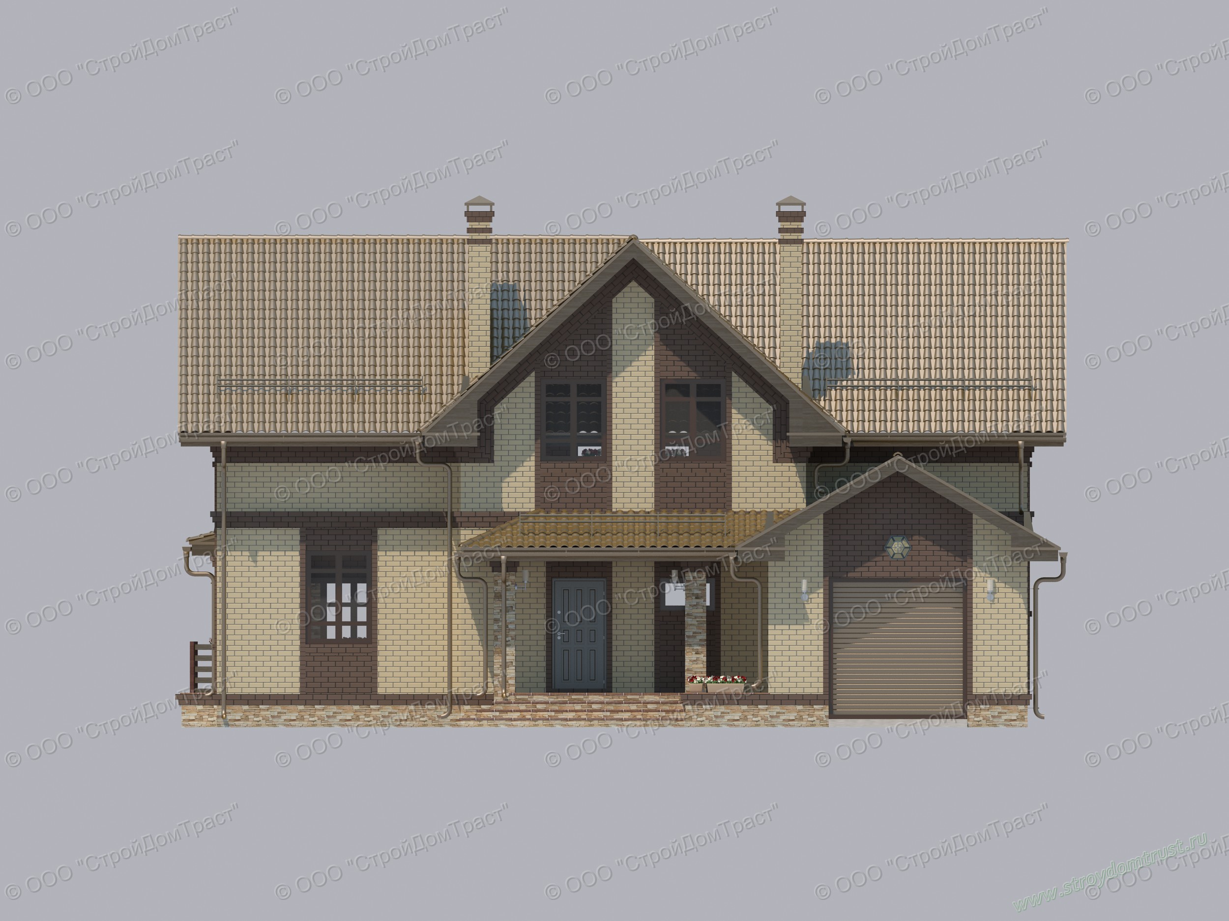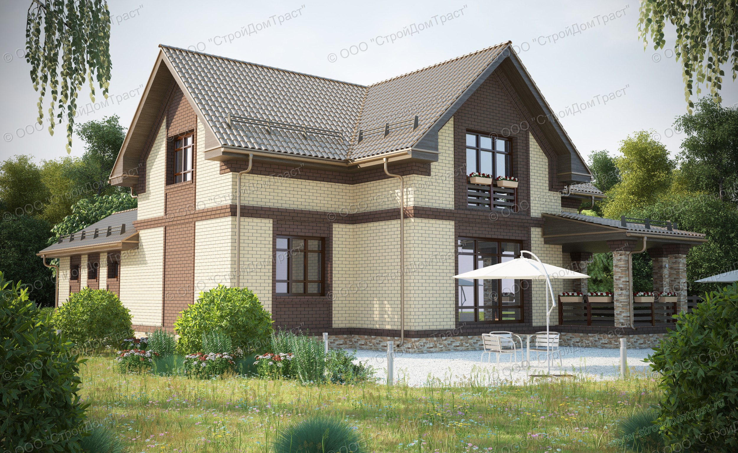 Красивый строгий дом в два этажа построен из газобетона. В качестве облицовки используется кирпич двух контрастных цветов: светло-кремового и темно-коричневого.