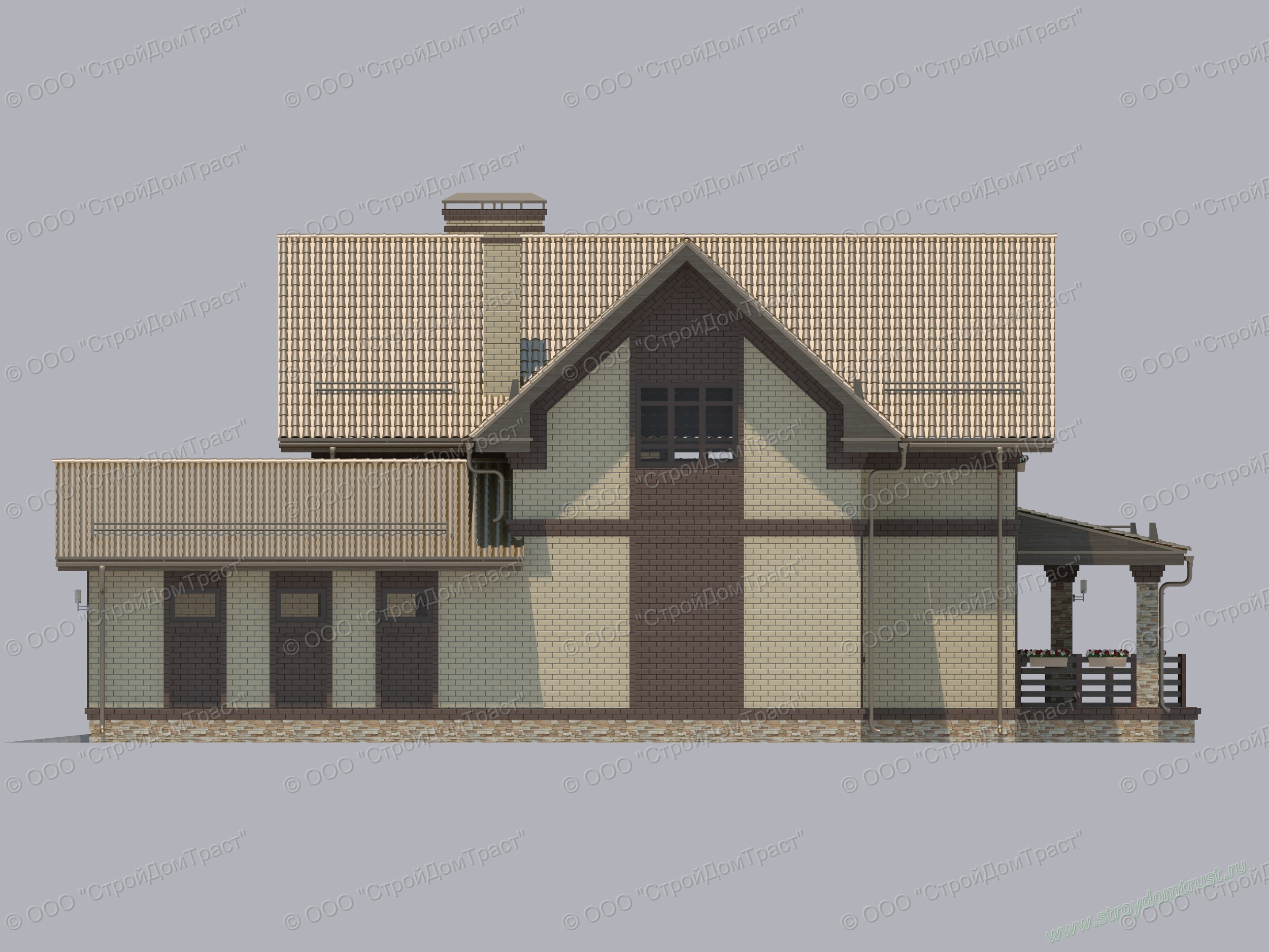 Ломаная двускатная крыша тоже имеет тёмный цвет. Материал изготовления — металлочерепица. Над крыльцом располагается отдельный навес, гармонирующий с кровлей.