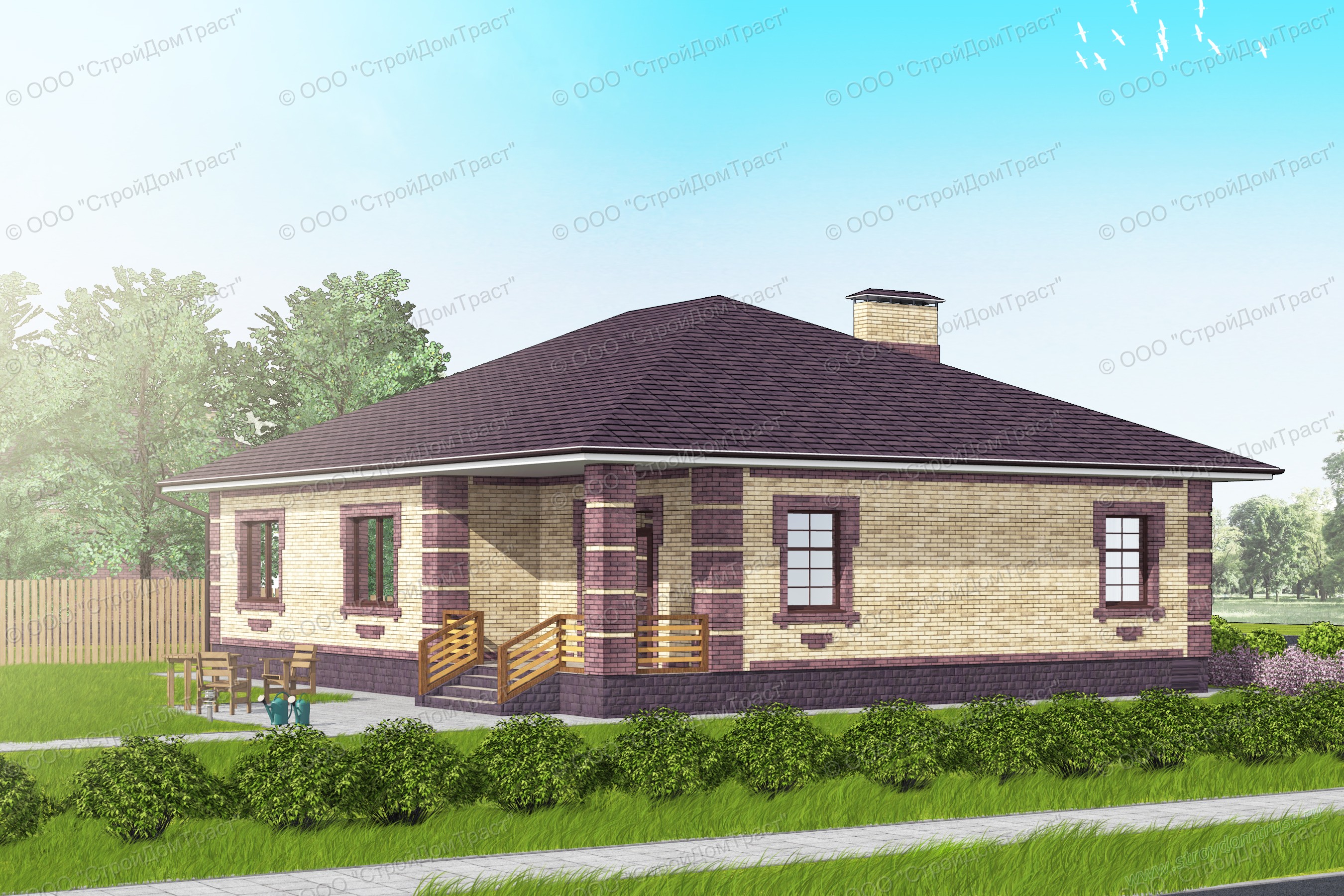Стены дома отделаны облицовочным кирпичом двух контрастных цветов, образующих узор в классическом стиле. Широкий выбор цветов этого отделочного материала открывает простор для фантазии и позволяет придумать сотни вариантов оформления фасада дома. Вальмовая крыша придает дому уютный вид.