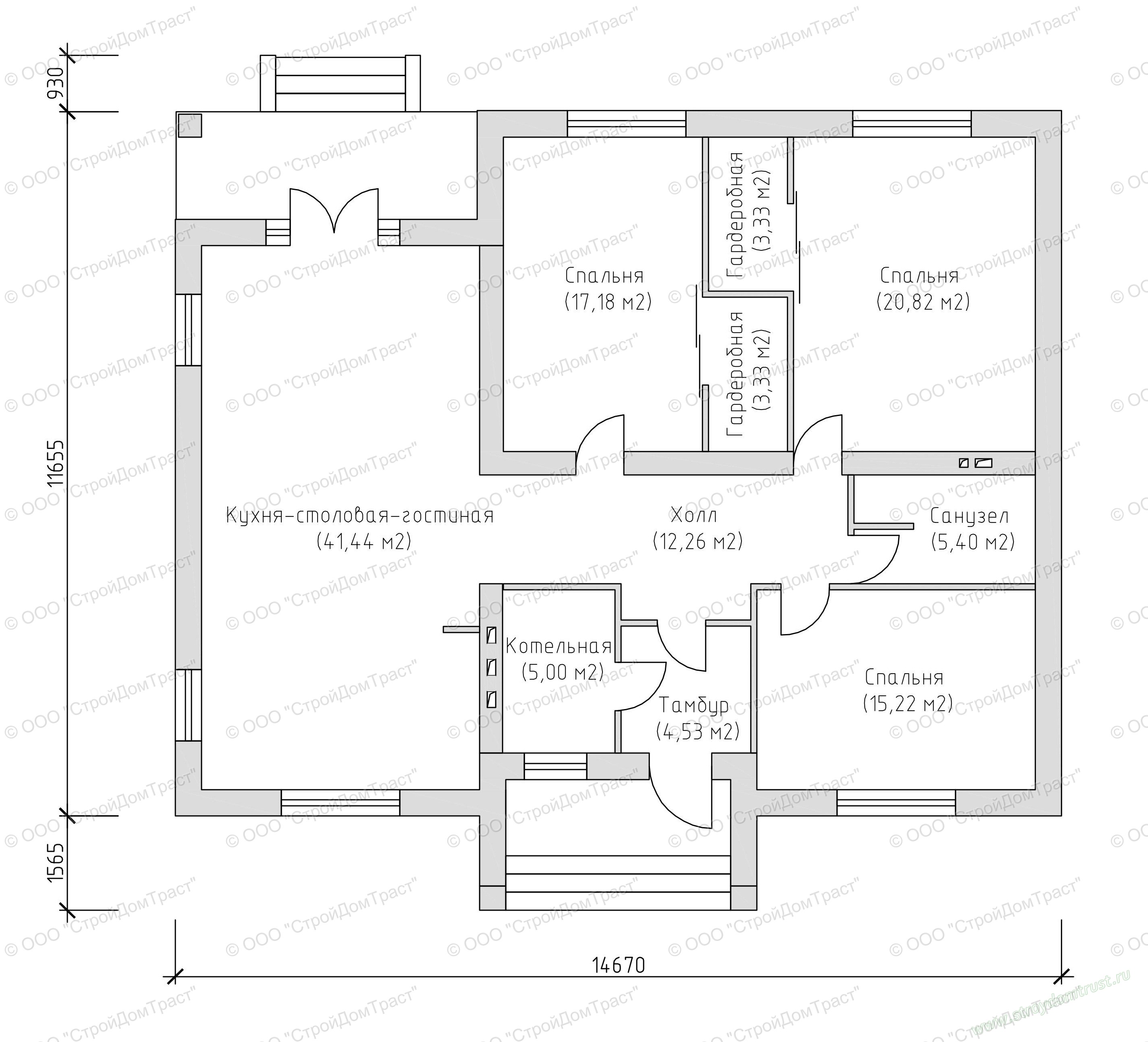 Одноэтажный коттедж из газобетона 14,67 х 14,15