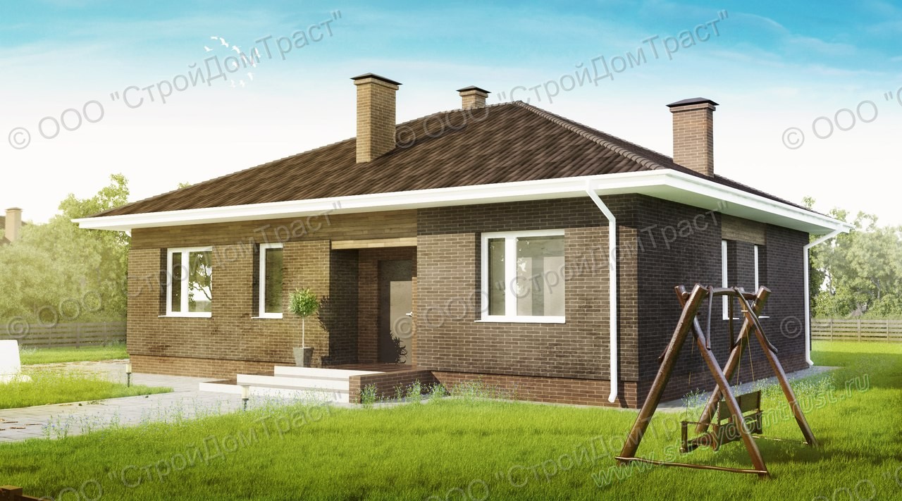 Площадь дома — 105 кв.м. Благодаря тому, что все помещения расположены на одном уровне, отпадает необходимость в лестнице и экономится жизненное пространство. Кроме того, снижаются расходы во время отопительного сезона, упрощается ремонт и обслуживание.