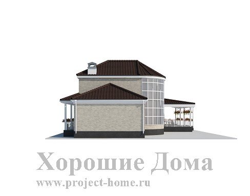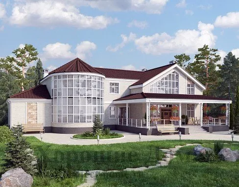 Загородный особняк из газобетона и стекла поразит вас своей неординарностью и оригинальным архитектурным замыслом автора проекта. Центральный вход в дом расположен на вместительной крытой террасе с колоннами. Левое крыло дома представляет собой круглую башню с фасадом из стекла. На первом этаже в этой башне размещается бассейн с комнатой отдыха, через стену от него – помещение бани и котельной под отдельной крышей и с отдельным входом.