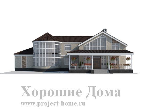 Также на первом этаже расположены 2 гостевые спальни, кухня-столовая и просторная гостиная. На втором этаже находятся 3 спальни и студия. Самая необычная внушительных размеров спальня расположена в стеклянной башне над бассейном, у неё есть свой санузел и гардеробная комната. Просторный холл имеет двойное освещение. С тыльной стороны здания имеется общее крыльцо под навесом, прикрывающим запасный выход и вход в помещение с котельной и бани. Гараж в данном проекте авторами не предусмотрен, по всей видимости, он может быть возведён в виде отдельно стоящего здания или навеса.