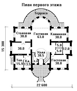 - 1 этаж - холл, гостиная, каминная, гостевая, столовая, кухня, топочная