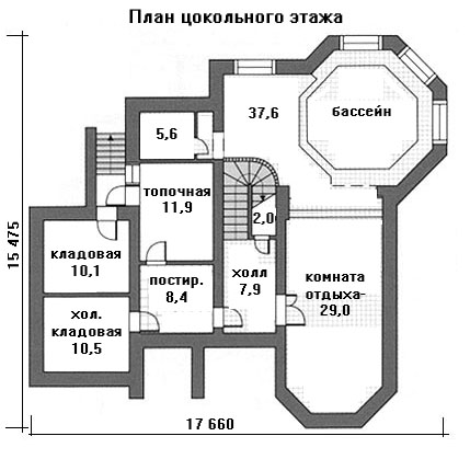 - цокольный этаж - топочная, постирочная, кладовые, с/у, бассейн, тренажерная.