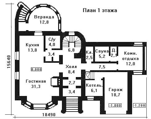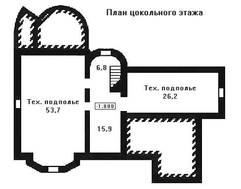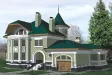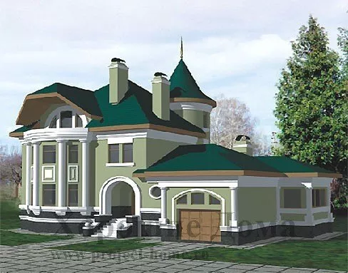 Коттедж с «замковыми» элементами в архитектуре воплотит самые романтические фантазии о своем особняке. Отличный проект для любителей средневековой романтики. Площадь коттеджа составляет 351,9 кв. м. и распределяется между цокольным этажом, двумя полноценными этажами и мансардой. Планировочные решения отражают оригинальность подхода к общей концепции здания. Так, например, лестница расположена в башенном блоке по оси парадного входа. На цокольном этаже расположены два технических помещения-«подполья» - 26,2 кв. м. и 53,7 кв. м. Гараж размещен на уровне земли и рассчитан на одно авто, а площадь его составляет 18,7 кв. м. Слева от главного входа в коттедж размещена гостиная комната размером 31,3 кв. м. Она практически совмещена с кухней, которая занимает пространство в 13,8 кв. м. В целом все помещение связано с полностью остекленной полукруглой верандой.