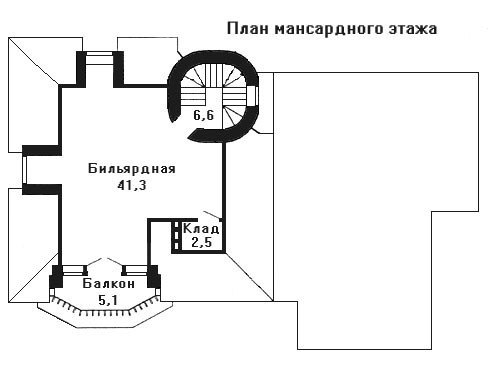 Второй этаж полностью отдан под спальный блок и большой чердак. В спальном блоке запланировано три комнаты, одна из которых имеет собственный выход на балкон. На мансардном этаже размещен бильярдный зал размером 41,3 кв. м.