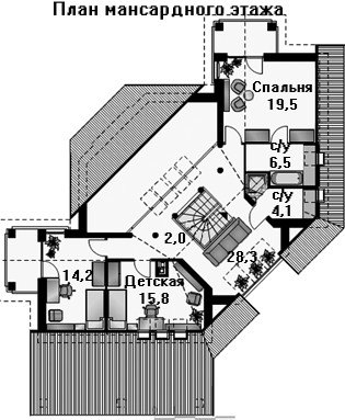 Мансардный этаж разделен на два блока, в одном из них размещена «хозяйская» спальня площадью 19,5 кв. м. с собственным санузлом. Во втором блоке находятся две детских комнаты – 14,2 кв. м. и 15,8 кв. м. На этаже так же имеется дополнительный общий санузел.