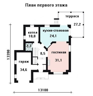 Левая половина первого этажа приходится на пристроенный гараж, помещение котельной и небольшой холл с открытой лестницей, связывающей между собой этажи. Остальная площадь этажа отводится под просторную гостиную с камином, соединённую с кухней-столовой широким арочным проёмом. На углу дома со стороный сада оборудована терраса, на которую можно выйти из помещения кухни и затем спуститься на участок.