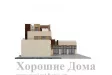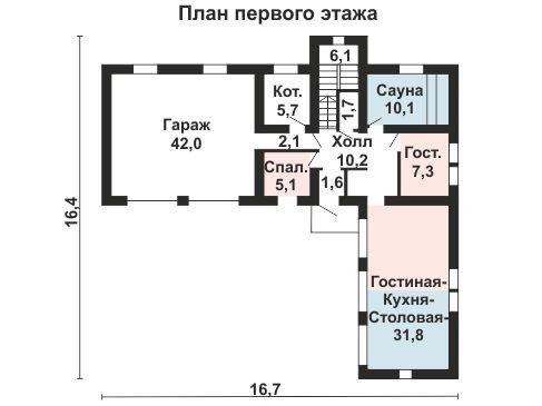 Небольшой холл с лестницей, ведущей наверх, делит особняк на две части. Левая часть дома отведена под встроенный гараж на две автомашины, котельную, гостевую спальню. Правая часть дома представлена единым помещением кухни-столовой-гостиной и блоком сауны.