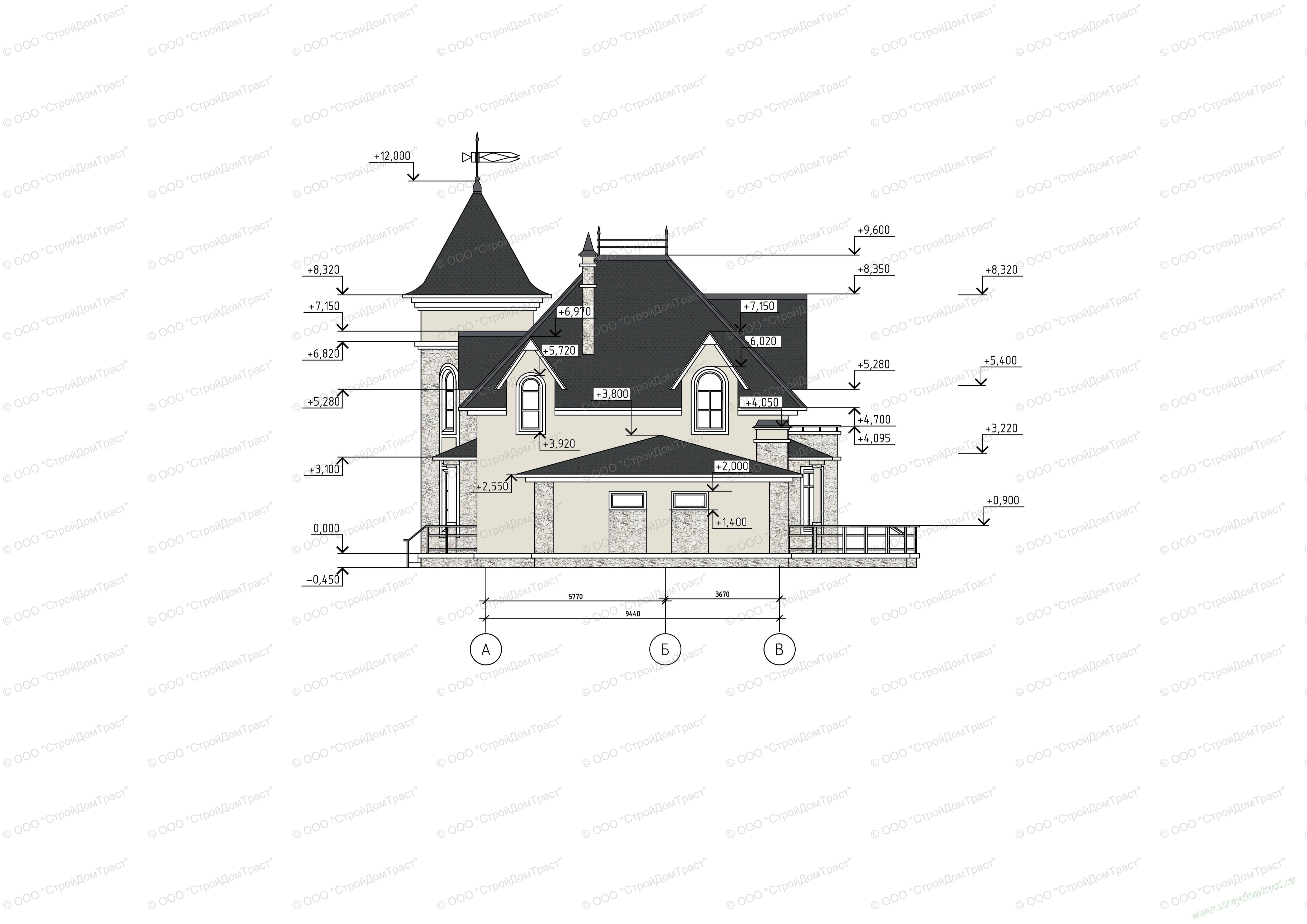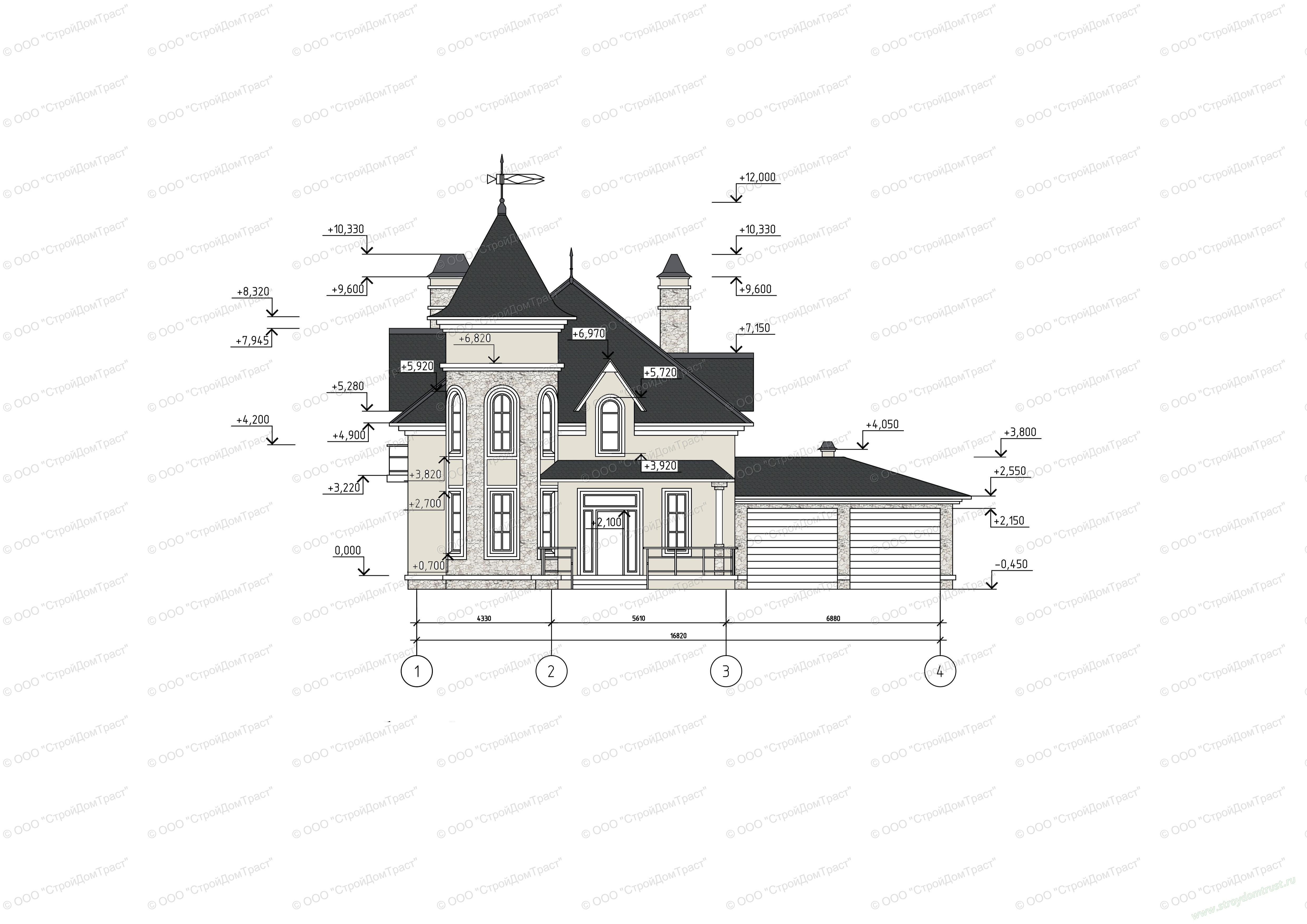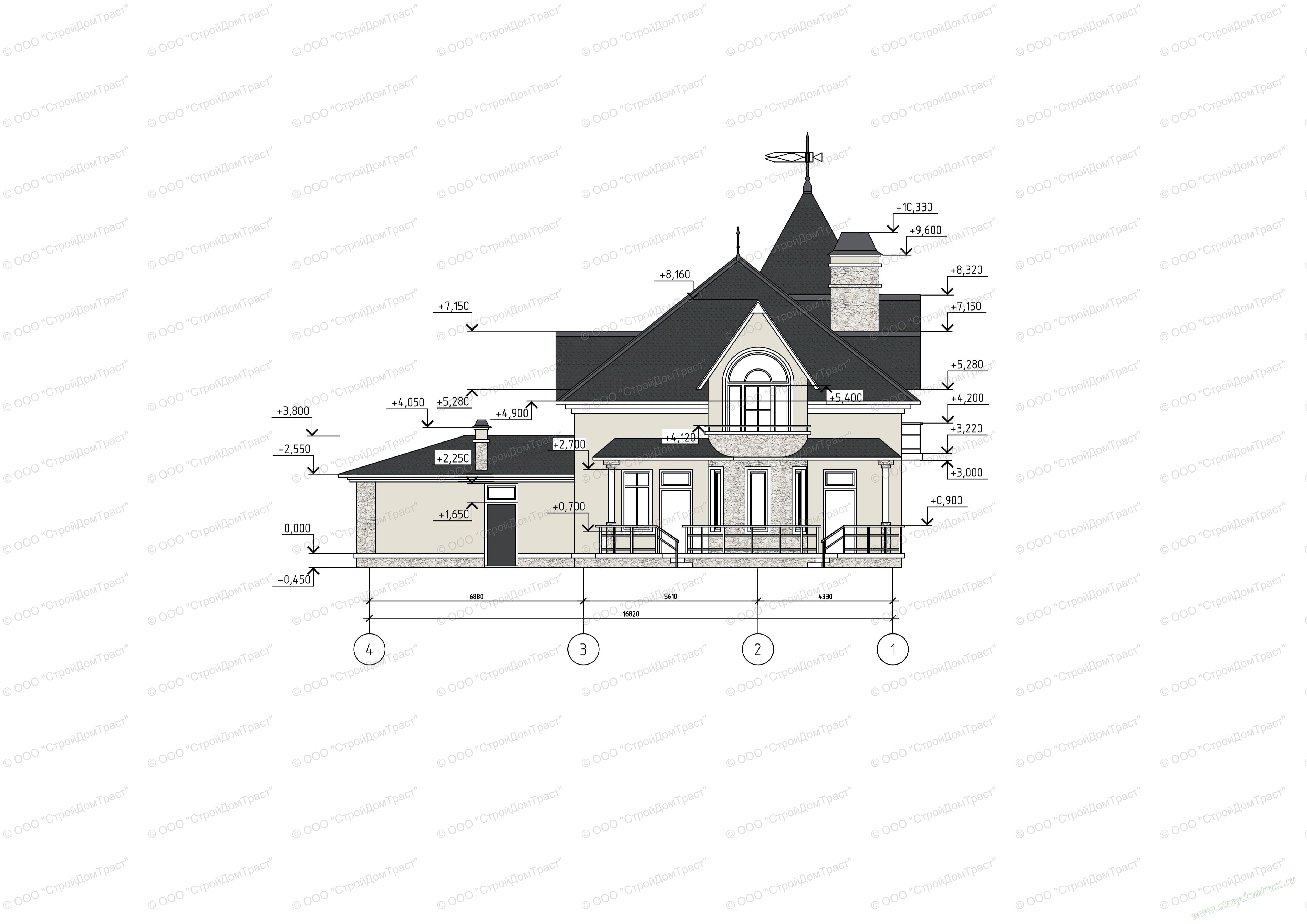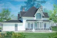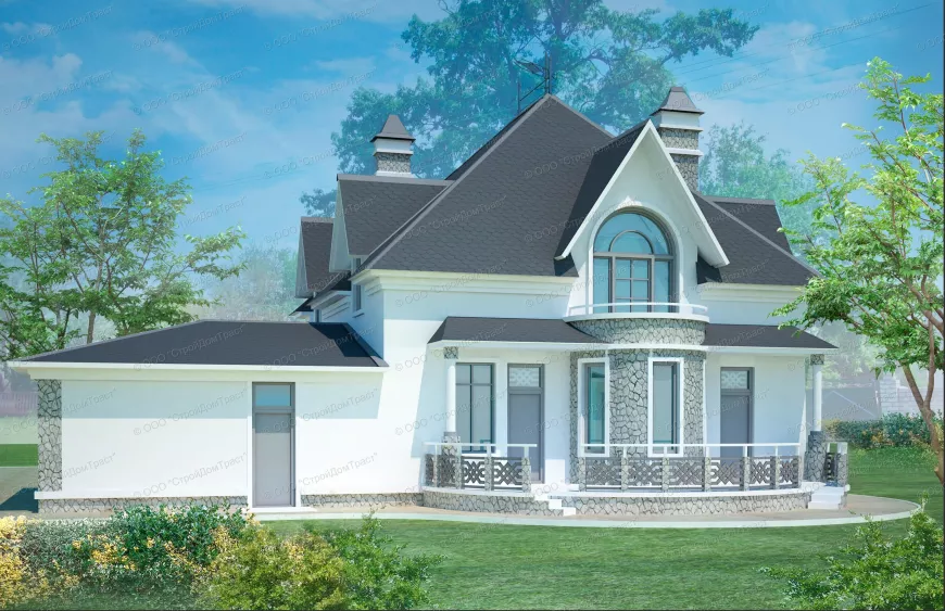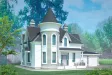 Этот дом не останется незамеченным среди соседских коттеджей. Множество интересных архитектурных деалей создают его нарядный и величественный облик, заставляют разглядывать его снова и снова. Здесь и оригинальное сочетание светлой штукатурки с облицовочным камнем, интересная многоскатаная крыша, полукруглые окна второго этажа, колонны, лепнина, декоративные карнизы на стенах и, конечно, же округлые эркеры, один из которых выполнен в виде башни.