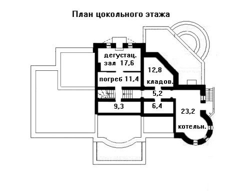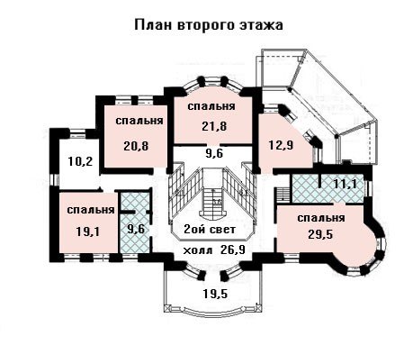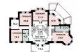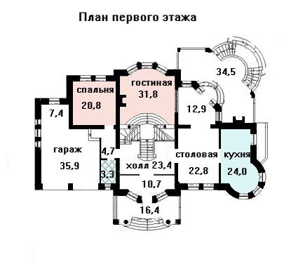 Планировочная схема основана на двух перпендикулярных осях, в месте пересечения которых расположен большой холл, освещенный как окнами второго этажа, так и крышным остекленным фонарем. Находящаяся в холле трехмаршевая торжественная лестница придает дому дворцовый характер. На главной планировочной оси напротив входа расположена гостиная, открывающаяся в сад «французским» балконом и зрительно связанная с зимним садом. Через помещение зимнего сада можно выйти на террасу, покрытую светопрозрачным козырьком и связанную с садом классической полукруглой лестницей.