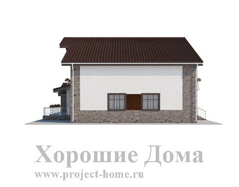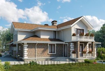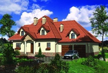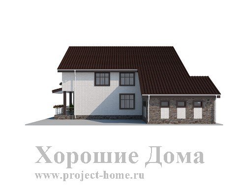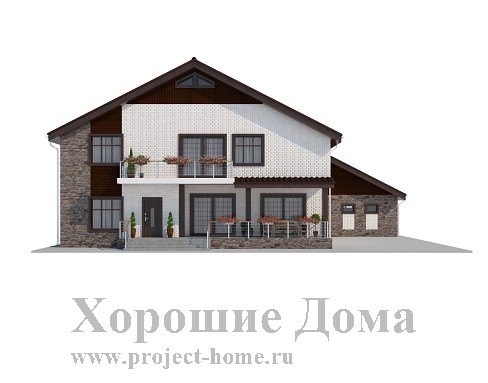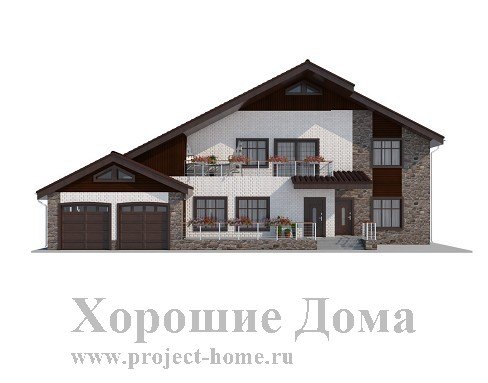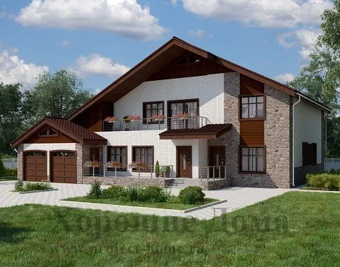 Интересный проект дома, рассчитанный для размещения и комфортного проживания трех семей. Площадь его составляет 353,48 кв. м., а гараж предусмотрен для размещения двух автомобилей.