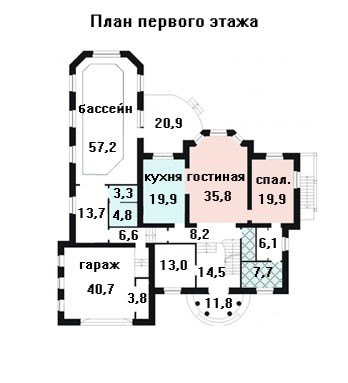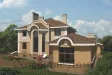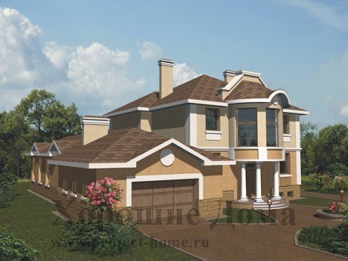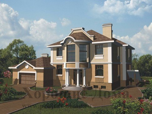 Трёхэтажный коттедж из газобетона состоит из пяти спален. Внизу фасада дом декорирован искусственным камнем, верхняя часть облицована штукатуркой шоколадного цвета. Большие окна на балконе придают зданию элегантности и изящности. Белые колонны поддерживают балкон, создавая аристократичный вид коттеджу. К дому пристроен гараж на два автомобиля. Просторная прилегающая территория позволяет хозяевам украсить ее цветами, керамическими статуэтками или же обычными зелеными кустарниками. На цокольном этаже находится тех.помещение, бар, бильярд, прачечная, кладовая. На первом этаже имеется бассейн, спальня, гостиная, кухня, гараж. Половина второго этажа разделена на чердак, две спальни и кабинет.