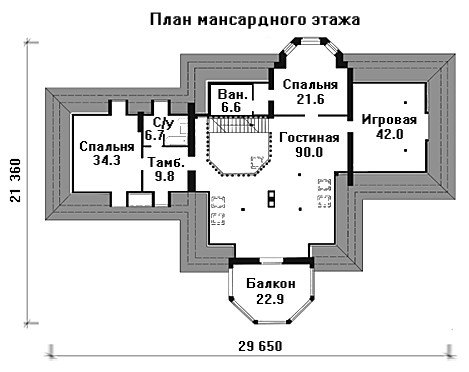 На мансардном этаже находятся помещения двух спален, гостиная и игровая комнаты. Из гостиной можно попасть на балкон с белоснежным парапетом.
