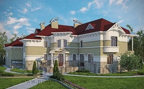Четырёхэтажный особняк из газобетона возможен в использовании как для гостиничного бизнеса, так и для большой семьи с детьми. Экстерьер данного дома довольно привлекателен, а, благодаря его светлым тонам, коттедж делается еще более изысканным. Загородный большой дом в европейском стиле создаст комфорт и уют для его жителей. Планировка дома тщательно продумана, в этом его особенность. На цокольном этаже находится кладовка, винная комната, резервные помещения. На первом этаже расположены две гардеробные, две спальни, гостиные, столовая, просторная кухня, комната отдыха, камин. На втором этаже имеется спортивный зал, четыре детские комнаты, рабочий кабинет, с/у, спальня. Мансардный этаж очень просторный и объединен в одну большую жилую комнату.