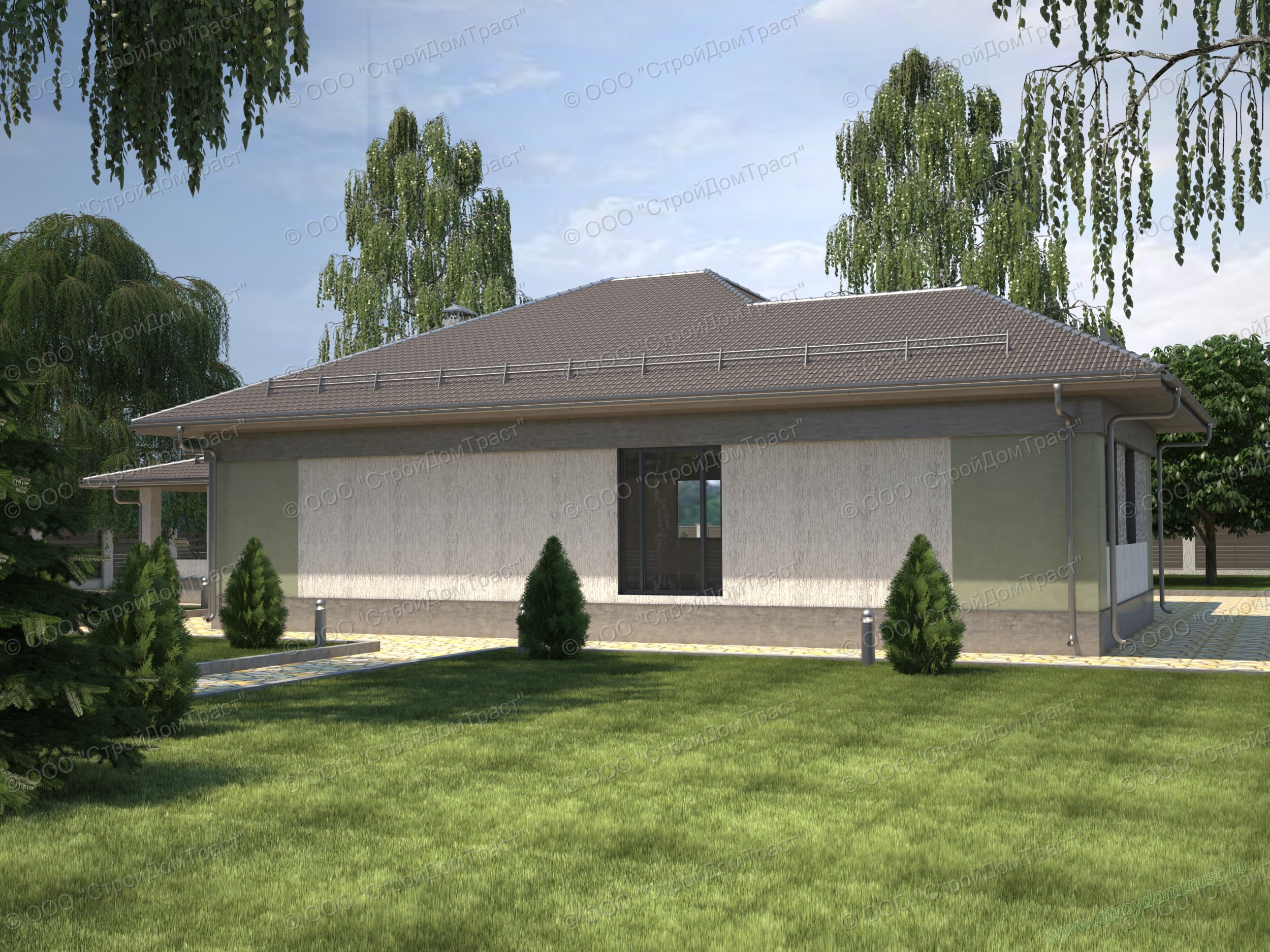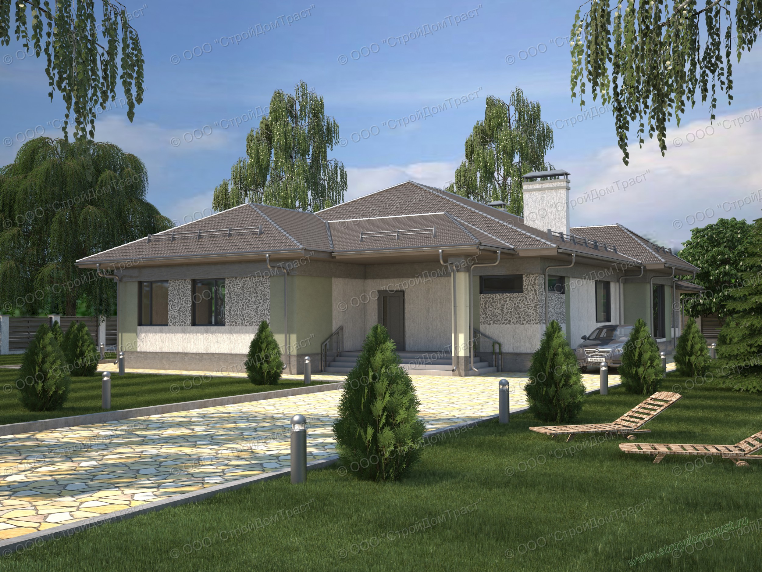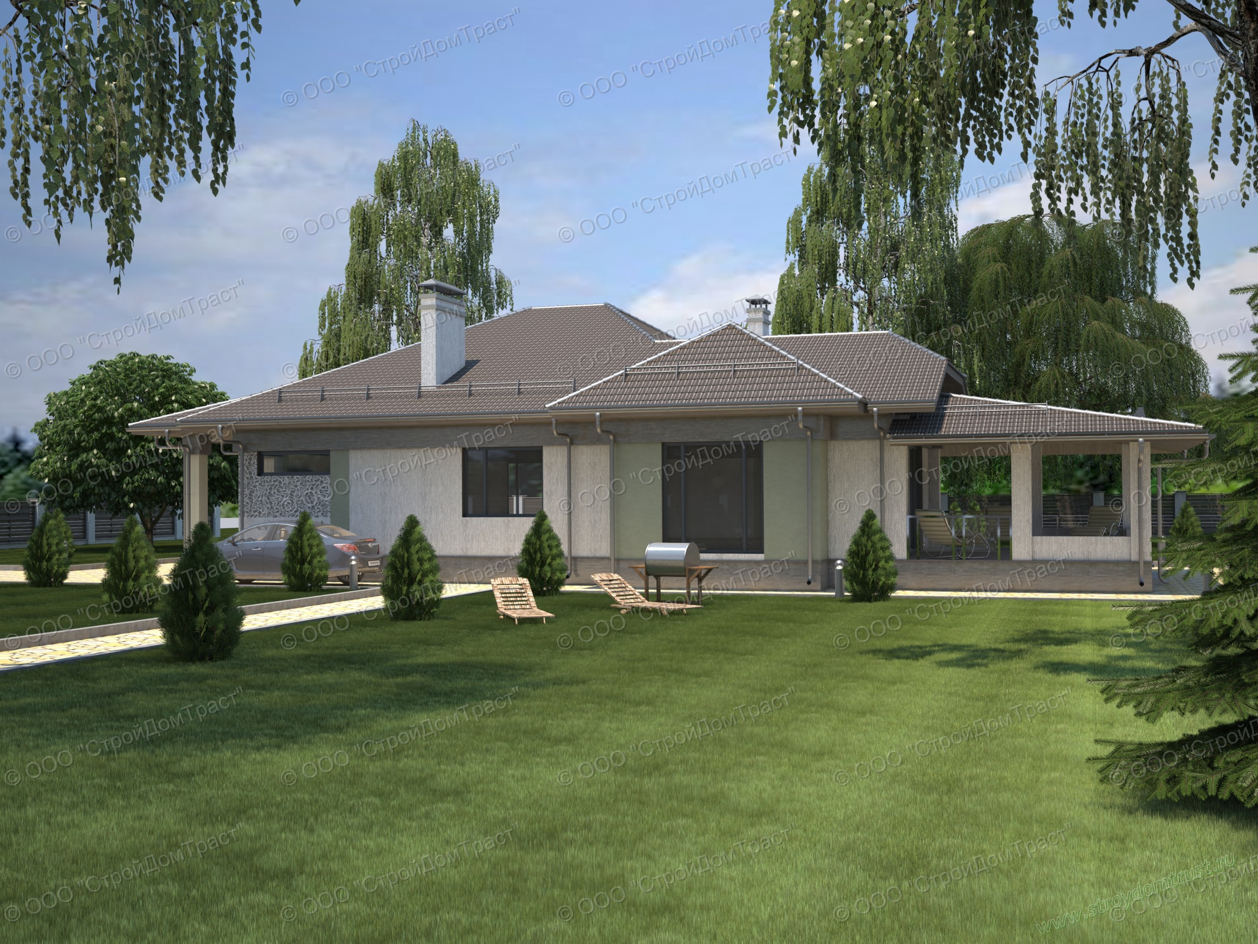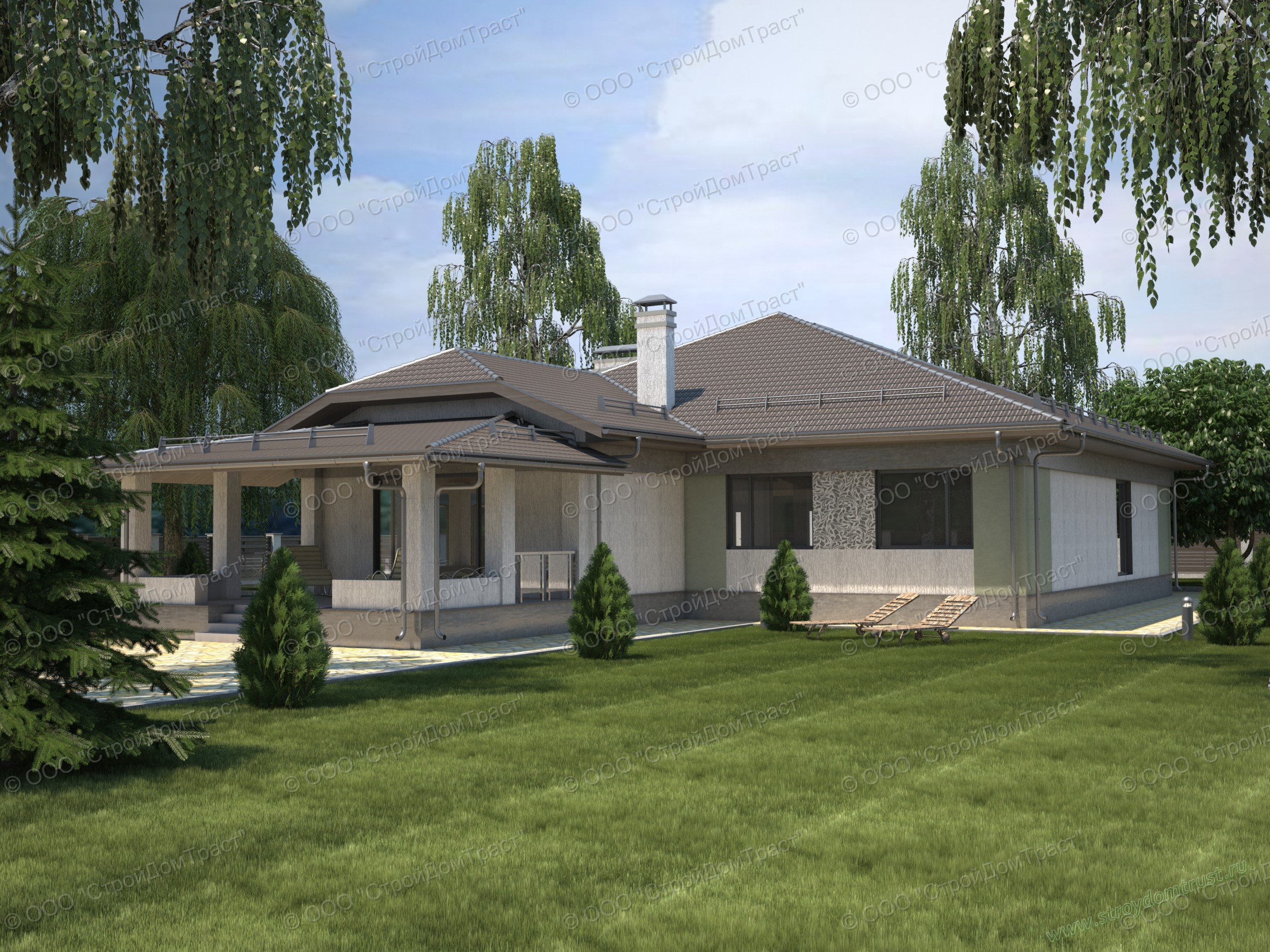 Эффектный одноэтажный коттедж для небольшой семьи. Такие дома выглядят немного непривычно для нашей страны, но в западных странах они широко распространены и пользуются большим спросом благодаря относительной простоте постройки и содержания.