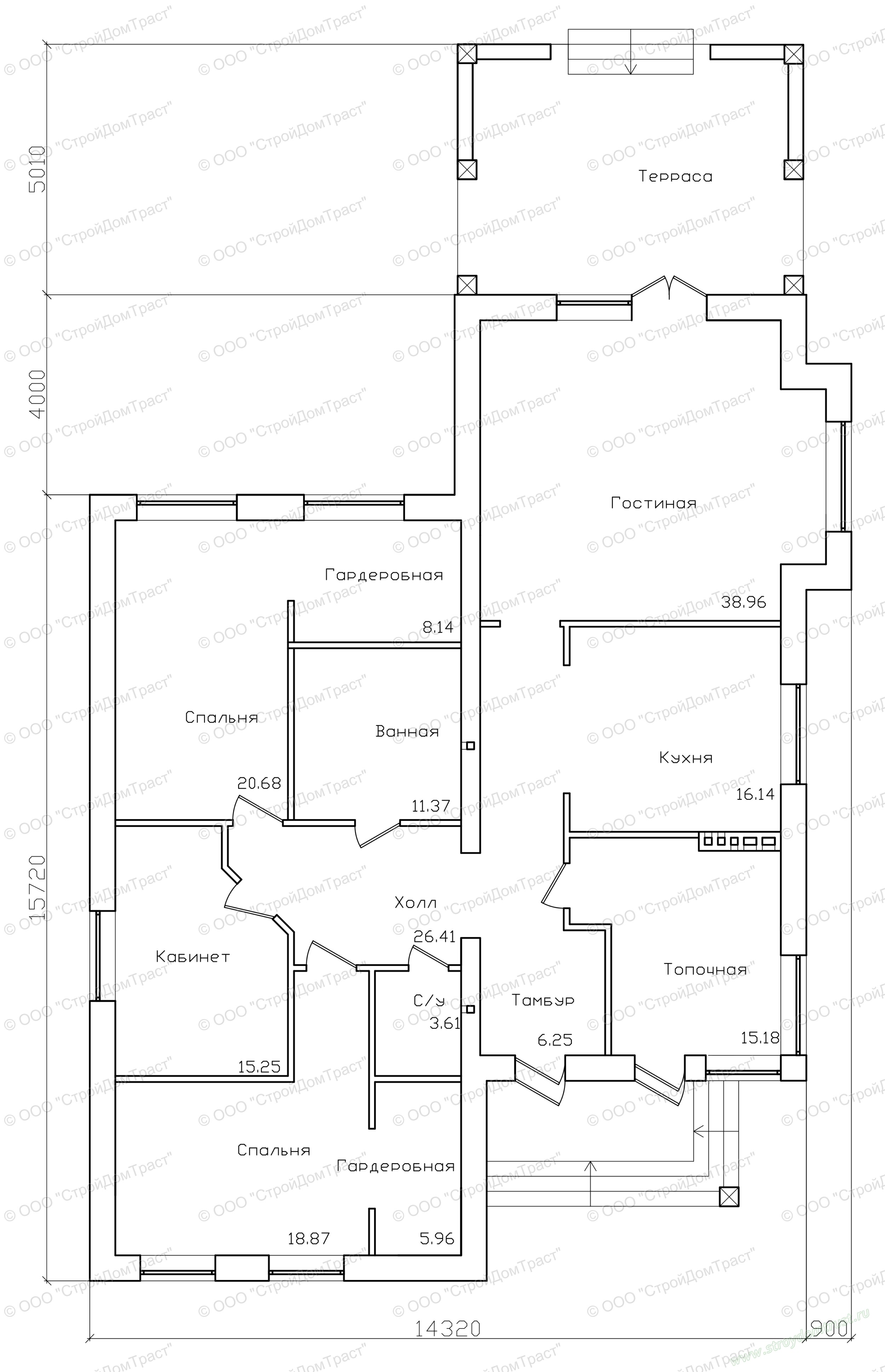 Также в доме есть небольшой тамбур-прихожая (6,3 кв.м), топочная (15,2 кв.м) с дополнительным входом с улицы, все помещения соединяет удобный холл (26,4 кв.м).