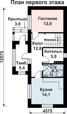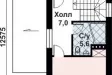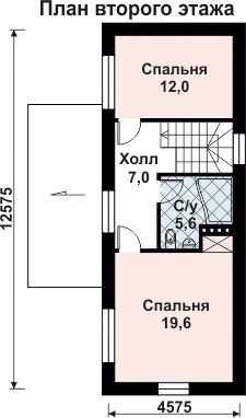 В центральной части коттеджа разместились хозяйственно-бытовые помещения, а кухня и гостиная находятся в противоположных частях дома. На мансардном этаже имеются две комнаты под спальни 12кв. м. и 19,6 кв. м. и ванная. Главной особенностью представляемого особняка можно назвать его удлиненную узкую форму, которая будет просто незаменима при необходимости воплощения проекта на узких земельных участках.