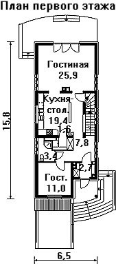 На первом этаже по плану предусмотрена гостиная комната площадью 25,9 кв. м. с выходом на террасу, расположенную позади дома. Кухня-столовая запланирована довольно просторная и занимает территорию в 19, кв. м. Приятным дополнением в данном проекте является наличие комнаты для размещения гостей, расположенной сразу же слева от парадного входа.