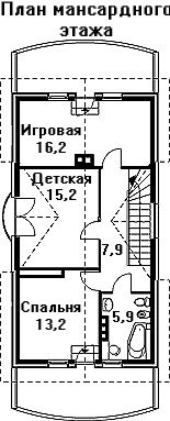 Второй этаж небольшой и распределен между спальной комнатой, детской и игровым залом размером 16,2 кв. м.