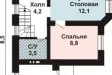 В эркере на первом этаже расположена кухня-столовая площадью 12,1 кв. м., а рядом с ней – небольшая спальная комната.