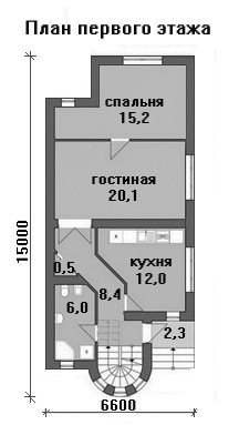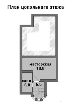 Коттедж имеет два этажа и цоколь, где предусмотрено просторное помещение под мастерскую и кладовая комната. Несмотря на необычную форму особняка, все помещения в доме довольно большие и удобно размещены. Планировка первого этажа включает гостиную комнату размером 20,1 кв. м., а так же кухню и дополнительную комнату свободного назначения. Она прекрасно подойдет для организации рабочего кабинета, спальни или гостевой.