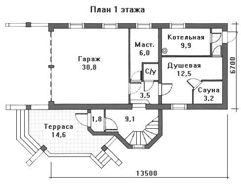 На первом этаже размещаются гараж на две автомашины, банный комплекс, состоящий из сауны и душевой, и котельная. Терраса у входа защищена нависающей конструкцией зимнего сада.