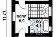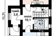 Вход в дом оформлен в виде небольшого тамбура, кухня и гостиная находятся в противоположных друг от друга частях дома, в центральной части коттеджа расположена ванная комната и лестница в мансарду.